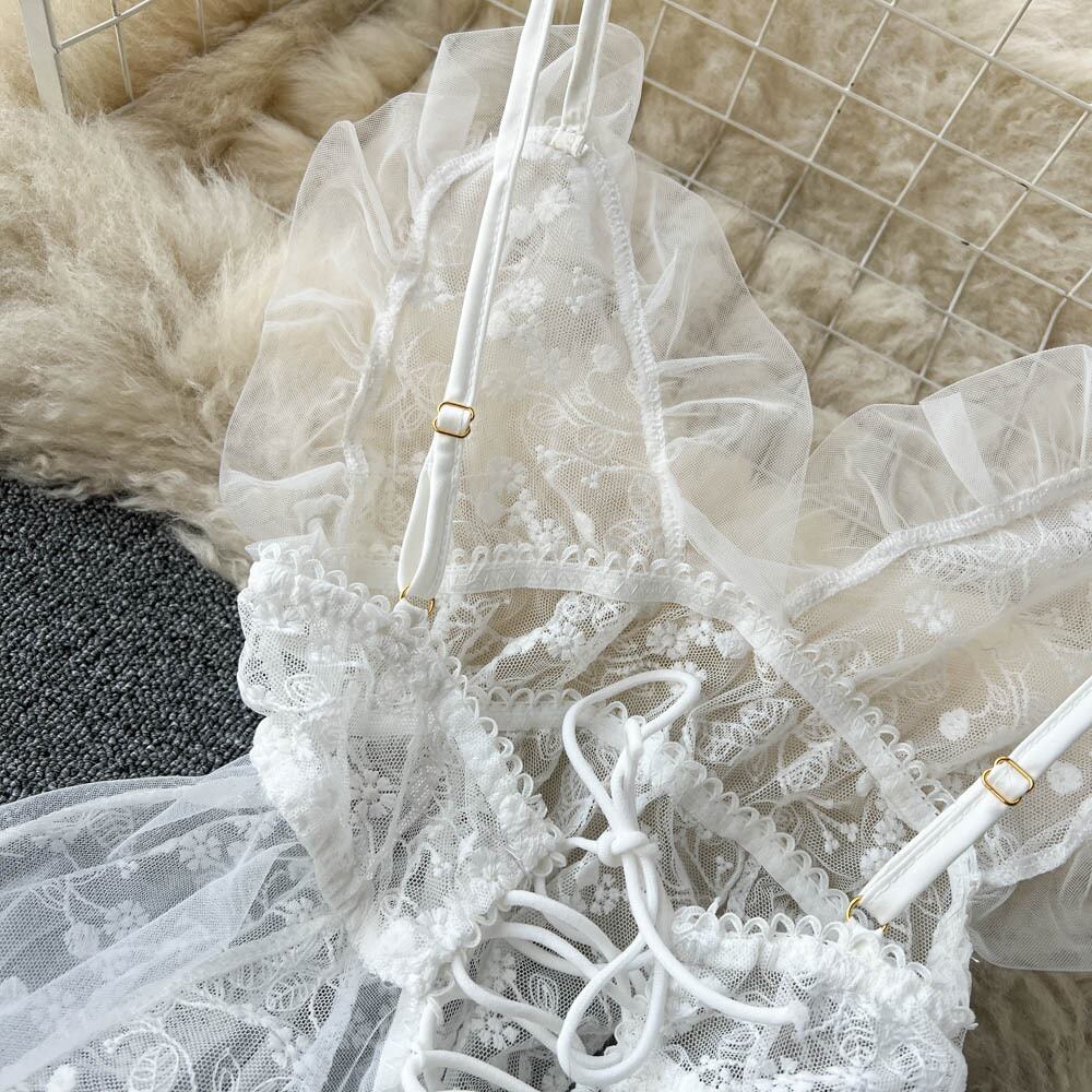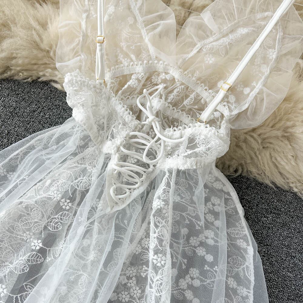 夏の純粋な欲望スタイルのデザインのセクシーなレースの刺繍フリルの視点セクシーなサスペンダー スーパー ショート ドレス ラッフル サマー 夏物 ピュア lyxaj56944189382