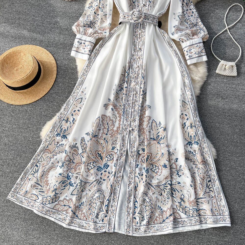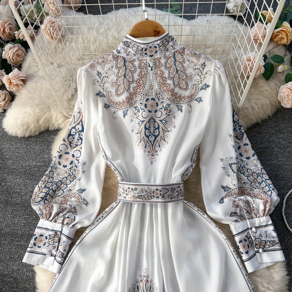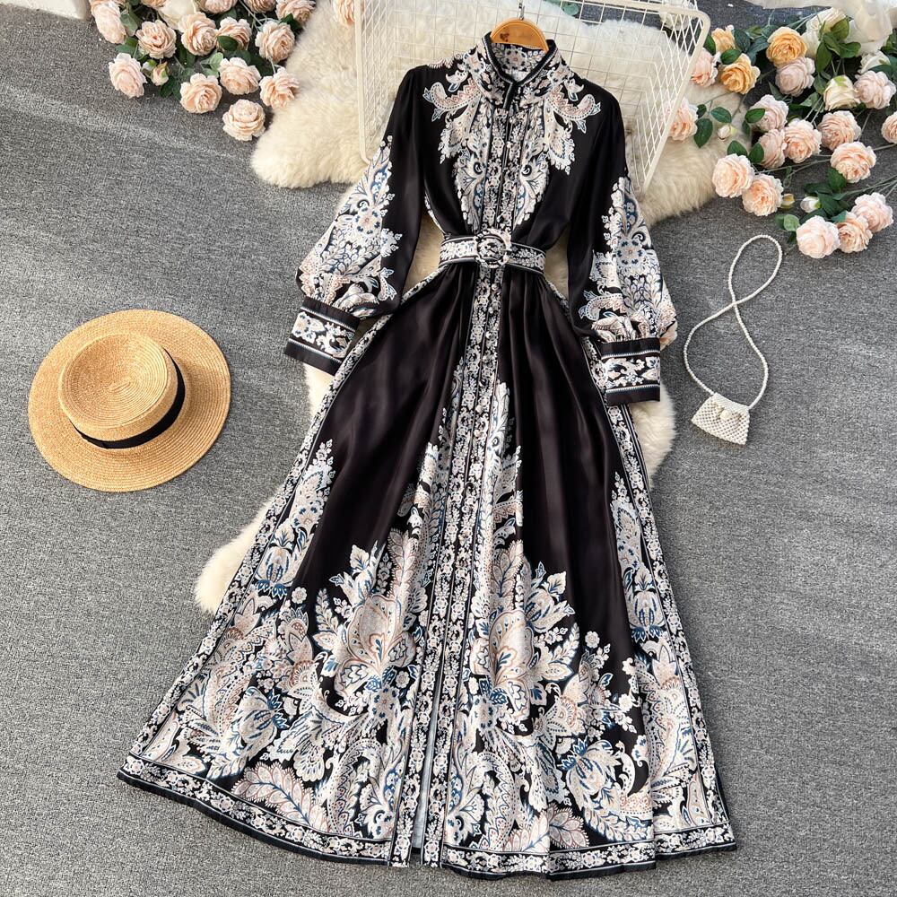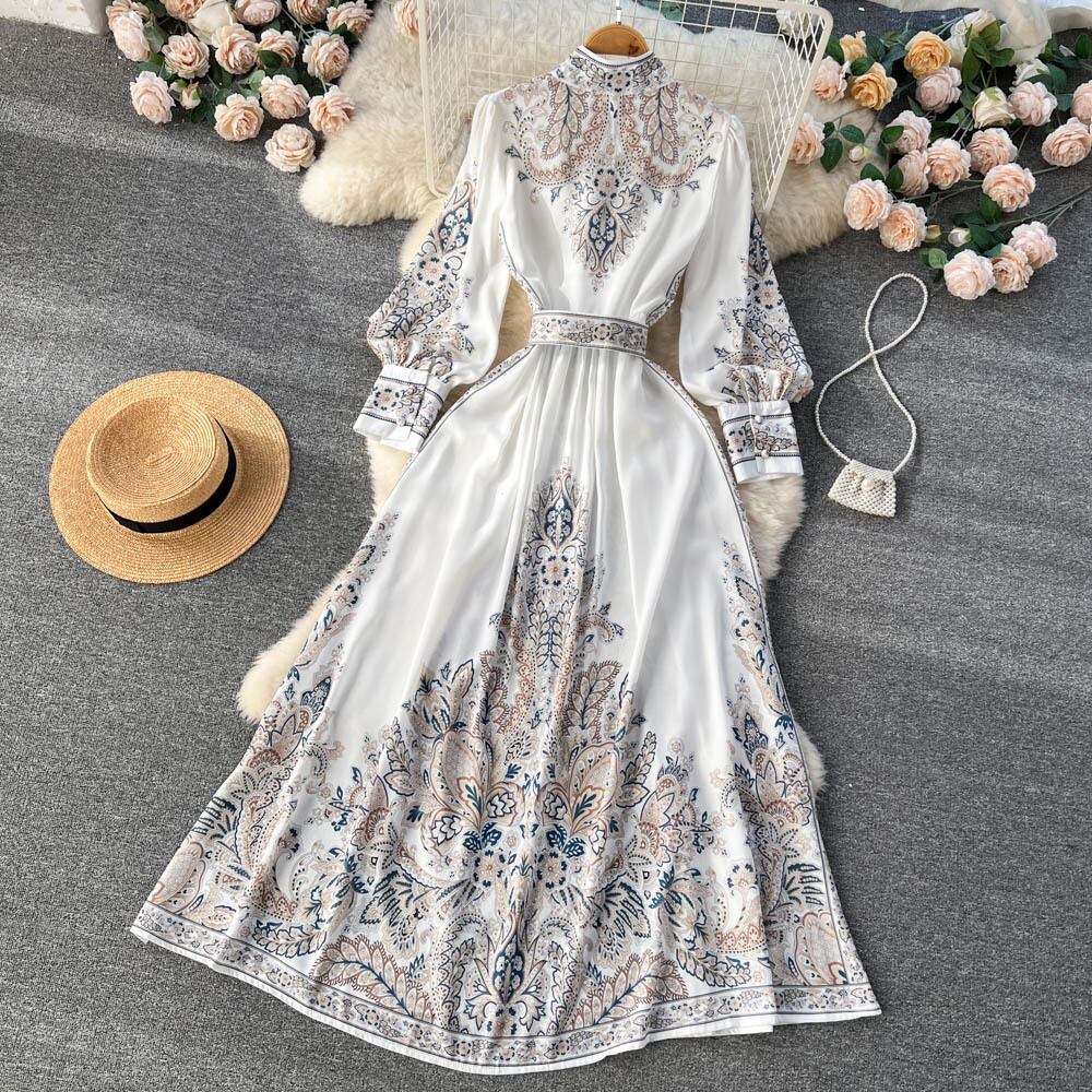 春と秋の新しい休日のスタイルのスタンドアップカラーランタンスリーブプリントドレスの女性のウエスト腰の大きなスイングAラインの膝丈のスカート スプリング 春物 オータム 秋物 lyxaj67164861406