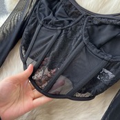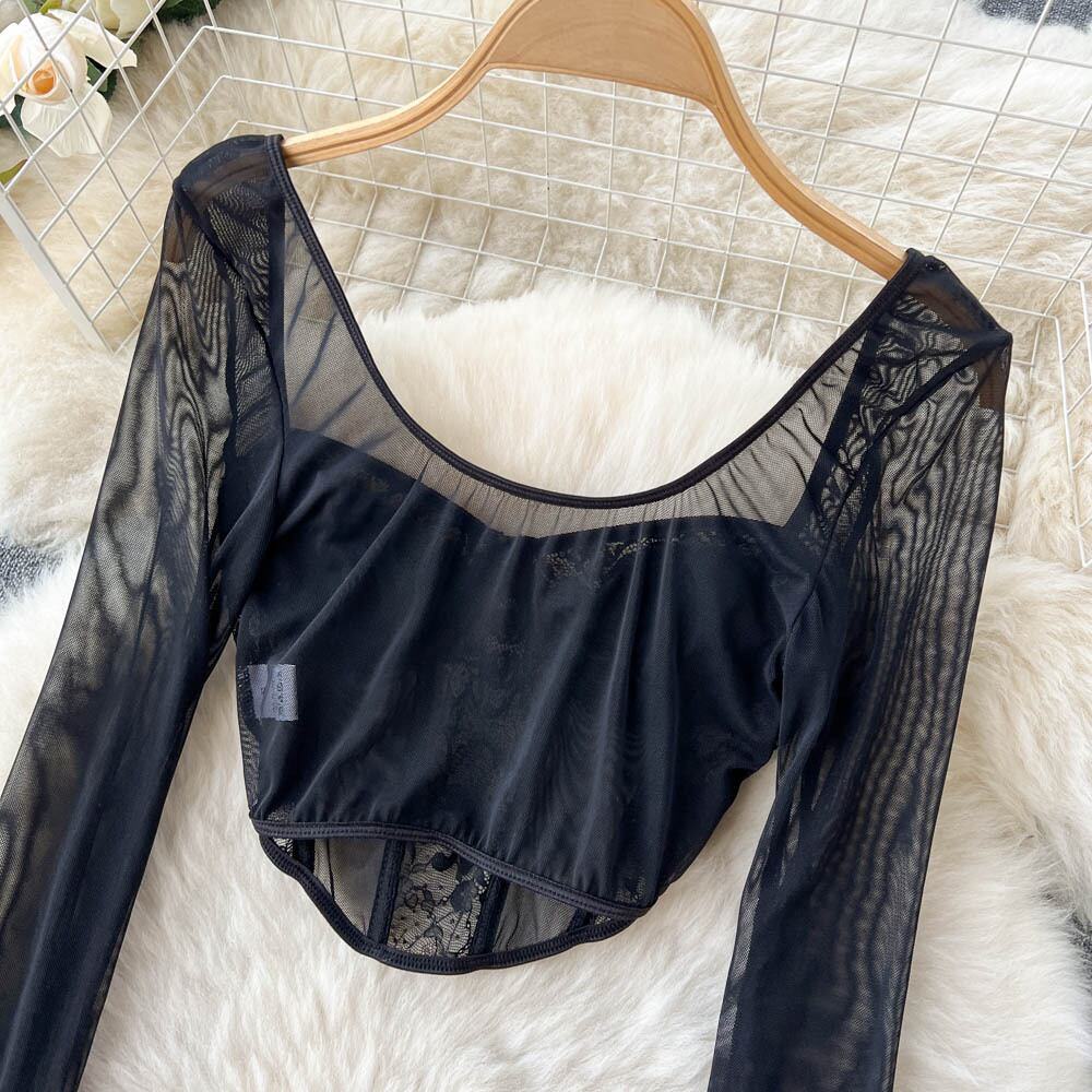 春と夏の純粋な欲望スタイルのセクシーなボトムスレースシャツの女性のフレンチスタイルのハイエンドスプライシングメッシュUネックショートトップタイド スプリング 春物 サマー 夏物 ピュア lyxaj45220535346