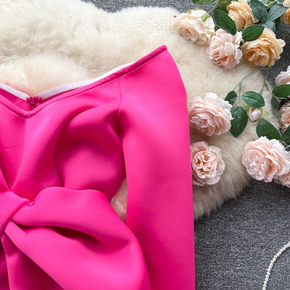 レトロな秋と冬の一言襟ストラップレスちょう結びサテンドレス女性スリムセクシーバッグヒップレディースロングスカートトレンディ リボン オータム 秋物 ウィンター 冬物 lyxaj33994035223