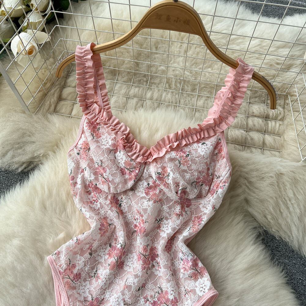 ガールフレンチレース刺繍花柄ウッドイヤーストラップチューブトップハイKジャンプスーツフェミニンジャンプスーツ lyxaj54195227797