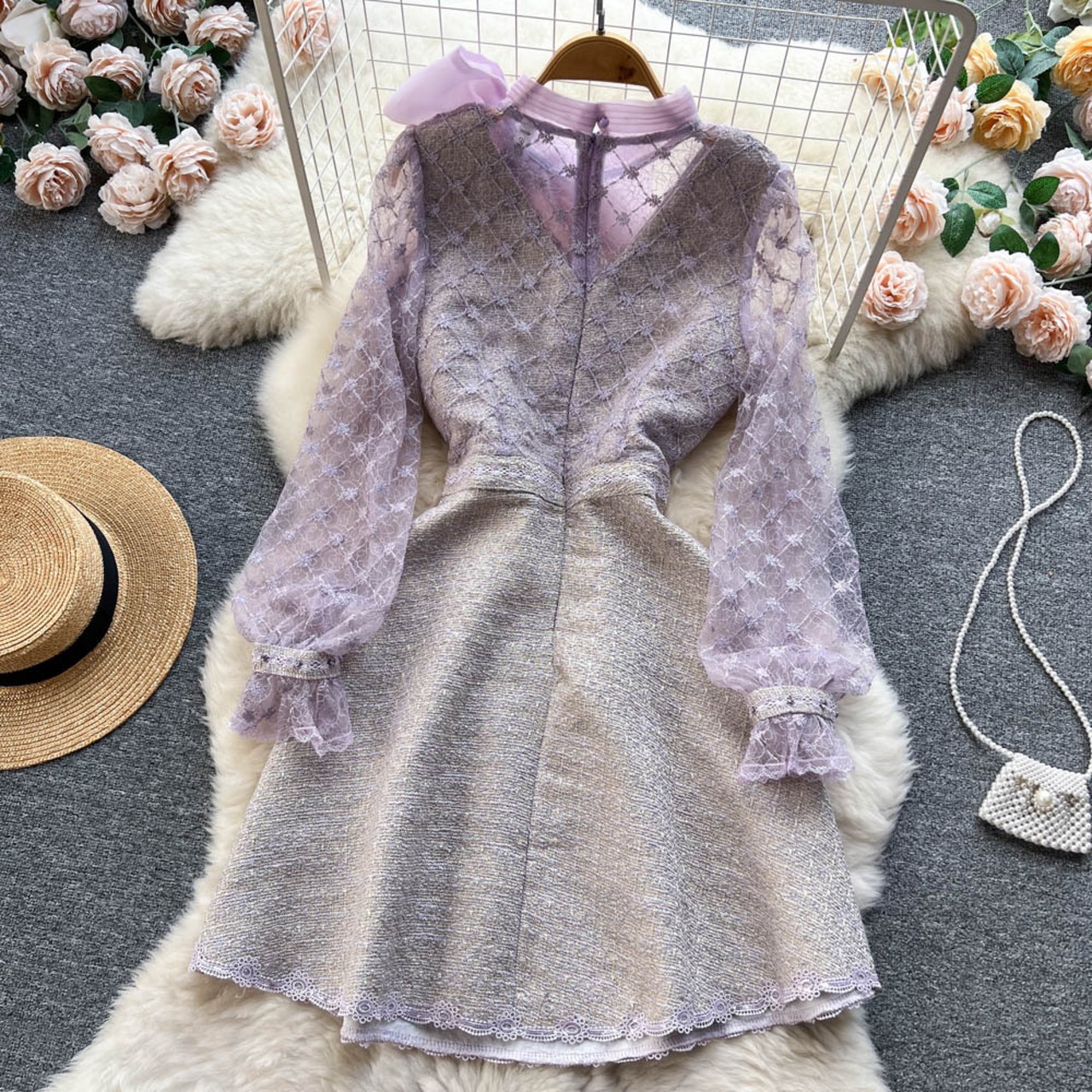 秋デザインセンス重工業ビーズメッシュ糸刺繍ちょう結びドレス女性長袖プリンセス A ラインバッグヒップスカート ロング レッド リボン オータム 秋物 Aライン lyxaj40955761703