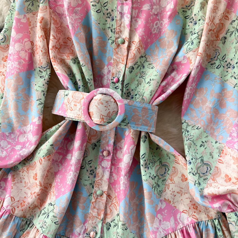 春の新作フレンチレトロプリントドレスレディースプリーツウエストパフスリーブミドル丈気質プリーツスカート スプリング 春物 lyxaj13199527507