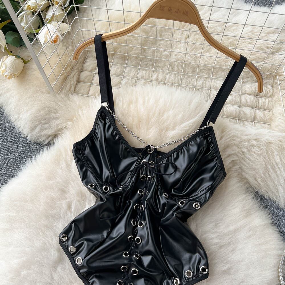 ヨーロッパとアメリカのスタイル イン ダーク スタイル デザイン センス チェーン巾着ネクタイ中空 PU レザー セクシーな高 k スリング ジャンプ スーツ ヨーロピアン lyxaj59768552532