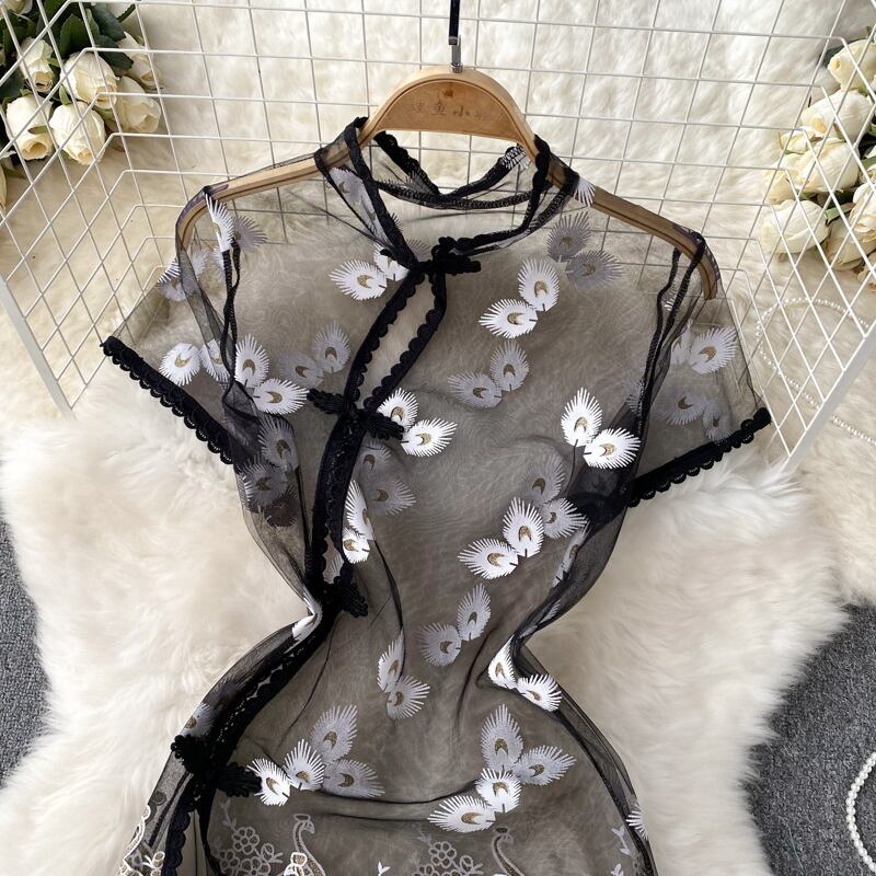 夏のセクシーな女の子純粋な欲望スタイル デザイン センス刺繍刺繍バックル中空スリット半袖バッグ ヒップ ドレス レッド サマー 夏物 ピュア lyxaj13346144984