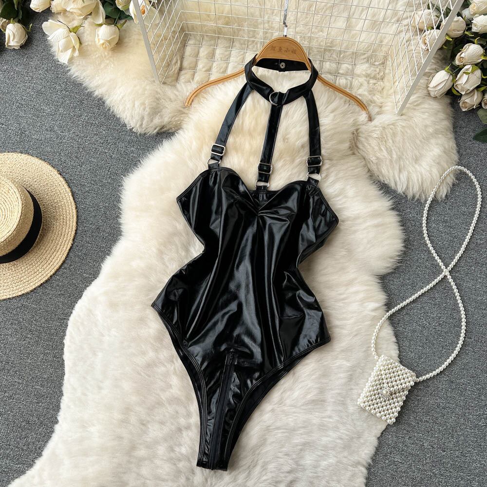 PUレザーハイKジャンプスーツ女性ハンギングネックウエストヨーロッパとアメリカスタイルのジャンプスーツのトレンドでセクシーな中空の女の子を感じます ヨーロピアン lyxaj38868802915