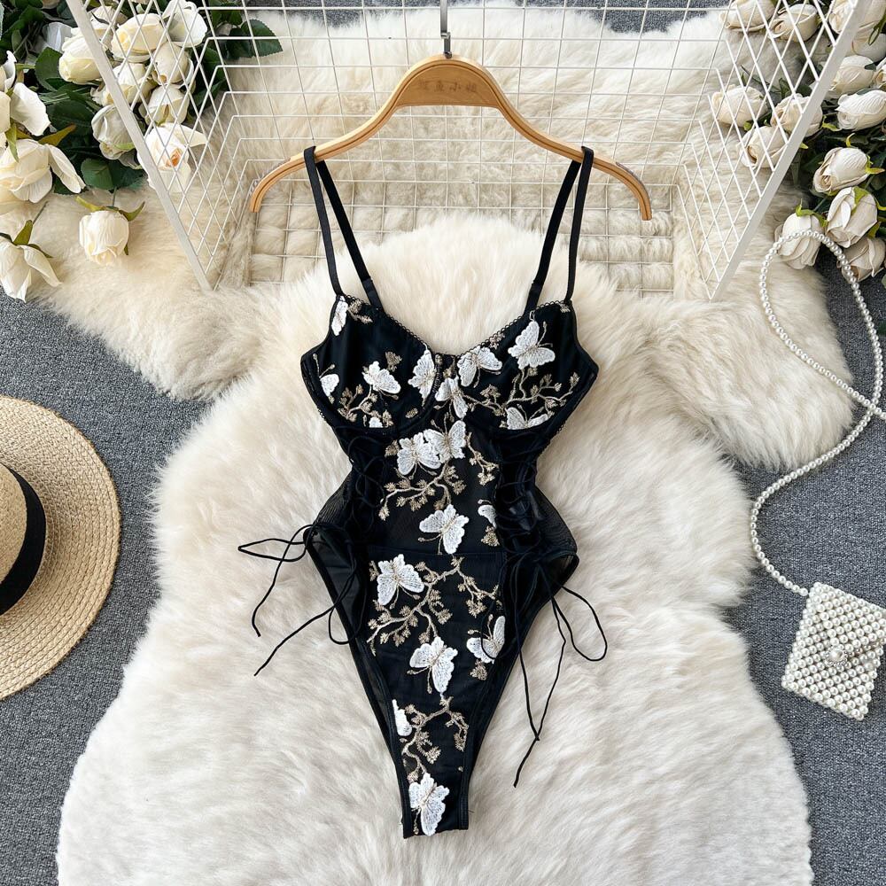 蝶刺繍レース メッシュ スプライシング印刷中空セクシーな巾着ストラップ サスペンダー高 k ジャンプ スーツ トレンディ lyxaj57922713323