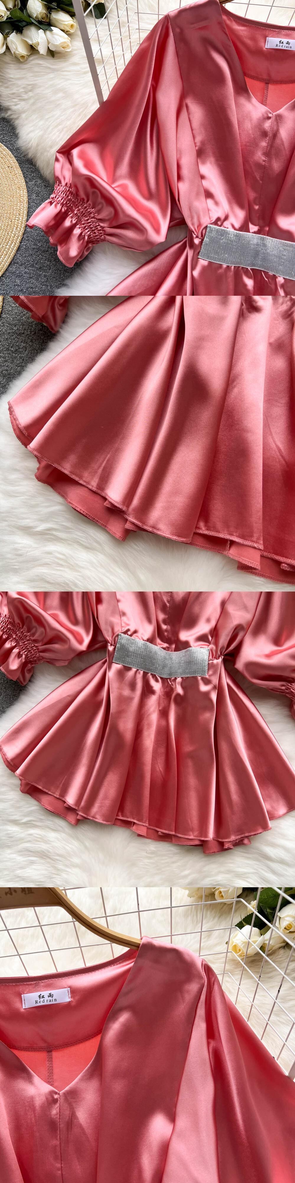 サテンシャツレディースデザインセンスニッチコート風パフスリーブ気質Vネックウエストスカートスリムフレンチトップ lyxaj53933214711