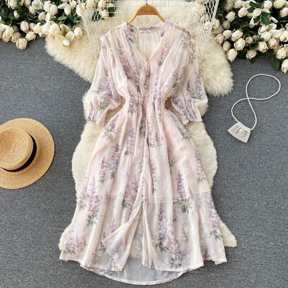 優しい風 ウエスト痩せ Vネックワンピース サマーレディースワンピース フレンチシック 綺麗花柄 ミドル丈スカート 夏物 lyxaj36919906529