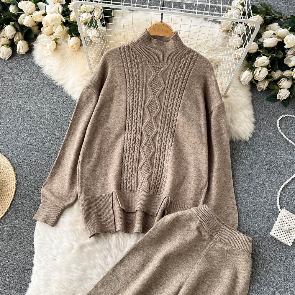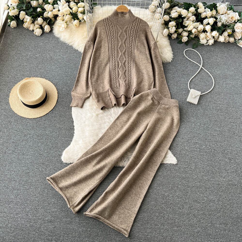 怠惰なハイエンドスーツハイネックルーズツイストイレギュラーセーター+ロールストレートワイドレッグパンツ2点セット lyxaj26408089383