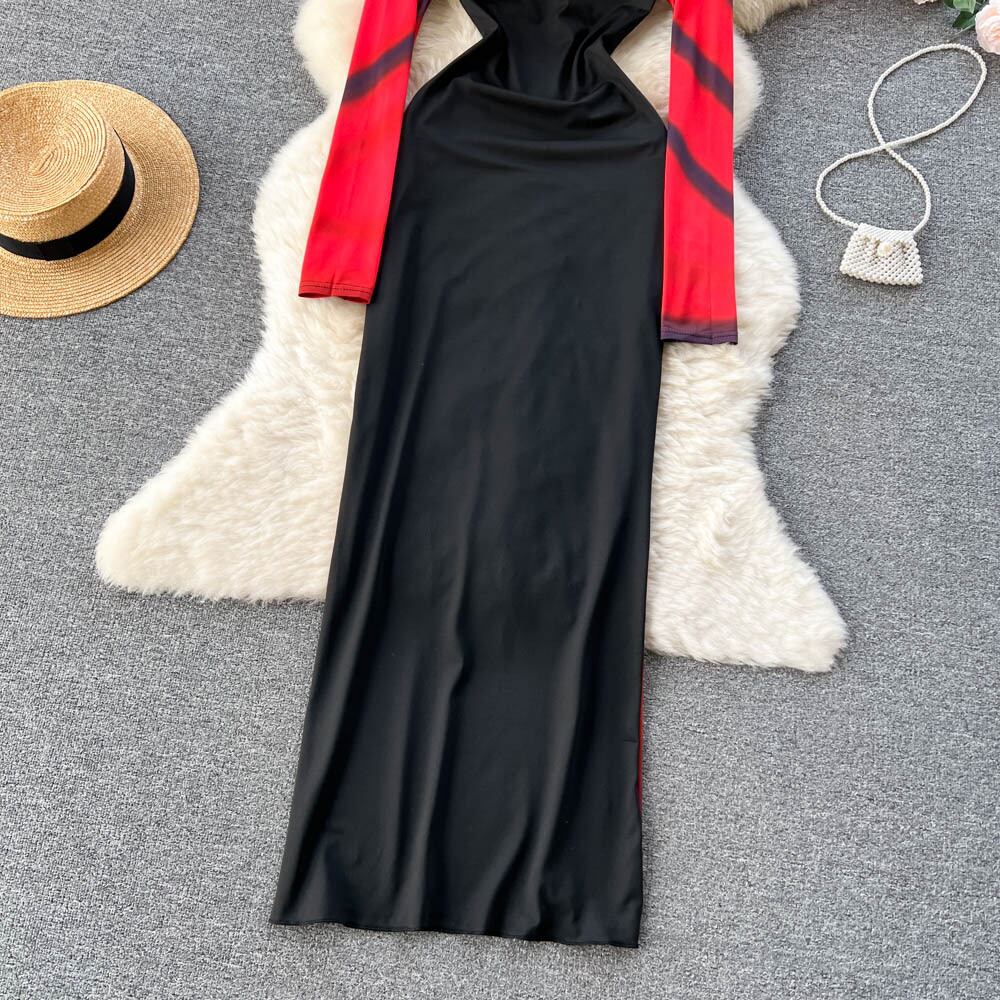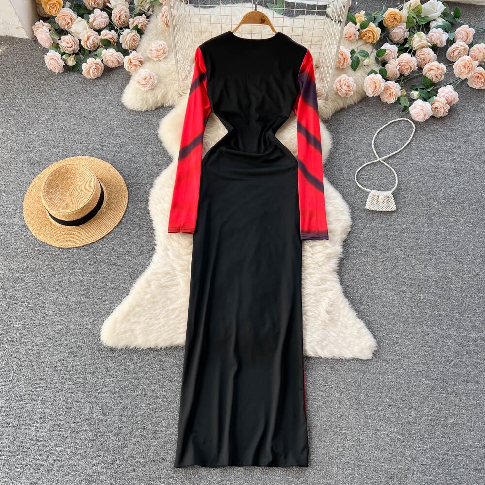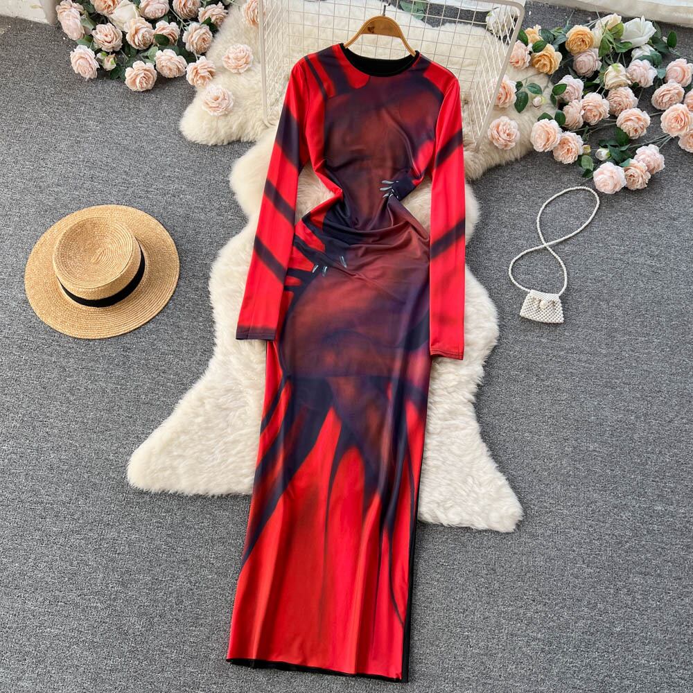 ヨーロッパとアメリカのinsスタイルの春と秋の新しい長袖のラウンドネックファッションパーソナリティプリントのセクシーなタイトバッグヒップスリットロングスカート スプリング 春物 オータム 秋物 Oネック ヨーロピアン lyxaj97074232453