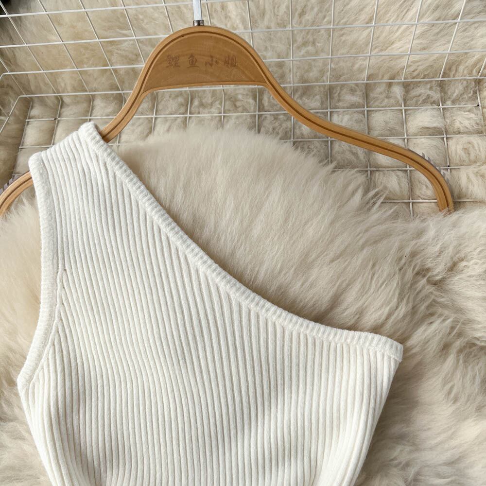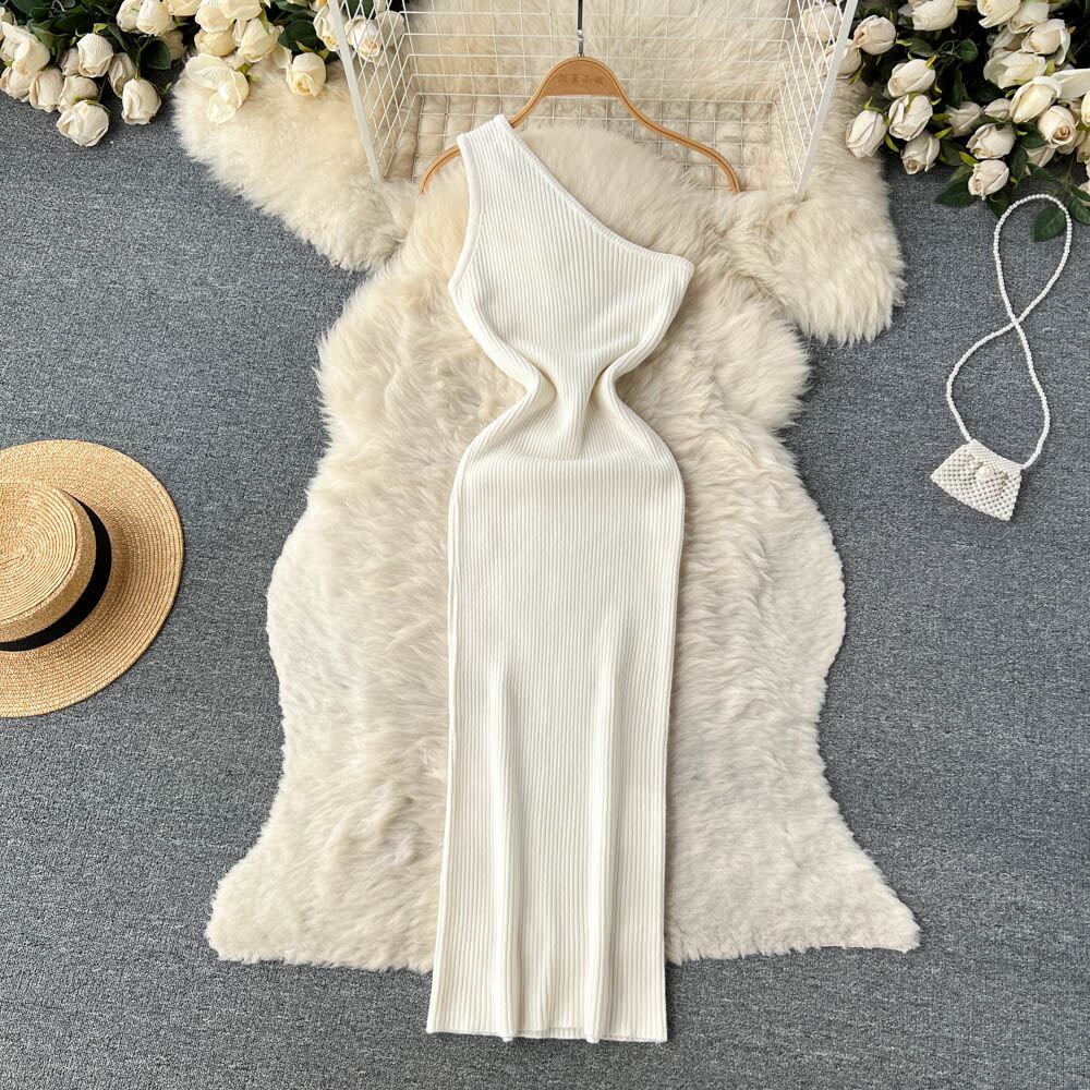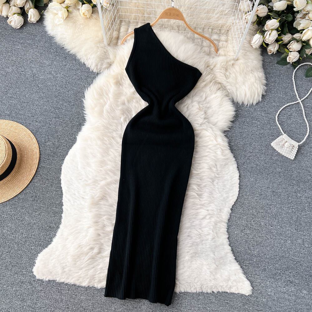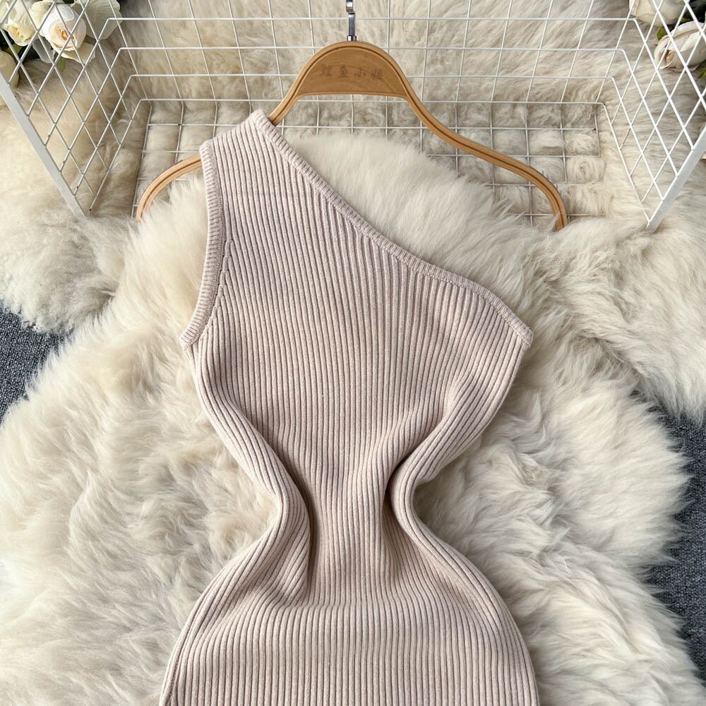 スラントショルダーストラップレスドレス女性の秋と冬のウエスト痩身ヘップバーンスタイルニットドレスヒップ付き オータム 秋物 ウィンター 冬物 lyxaj94066272404