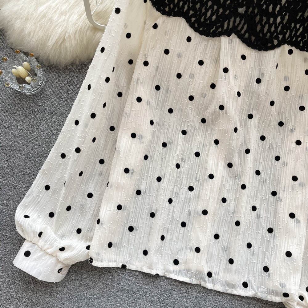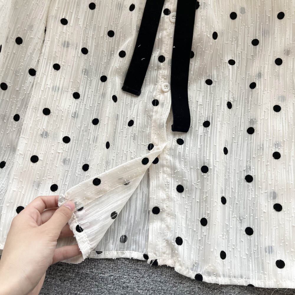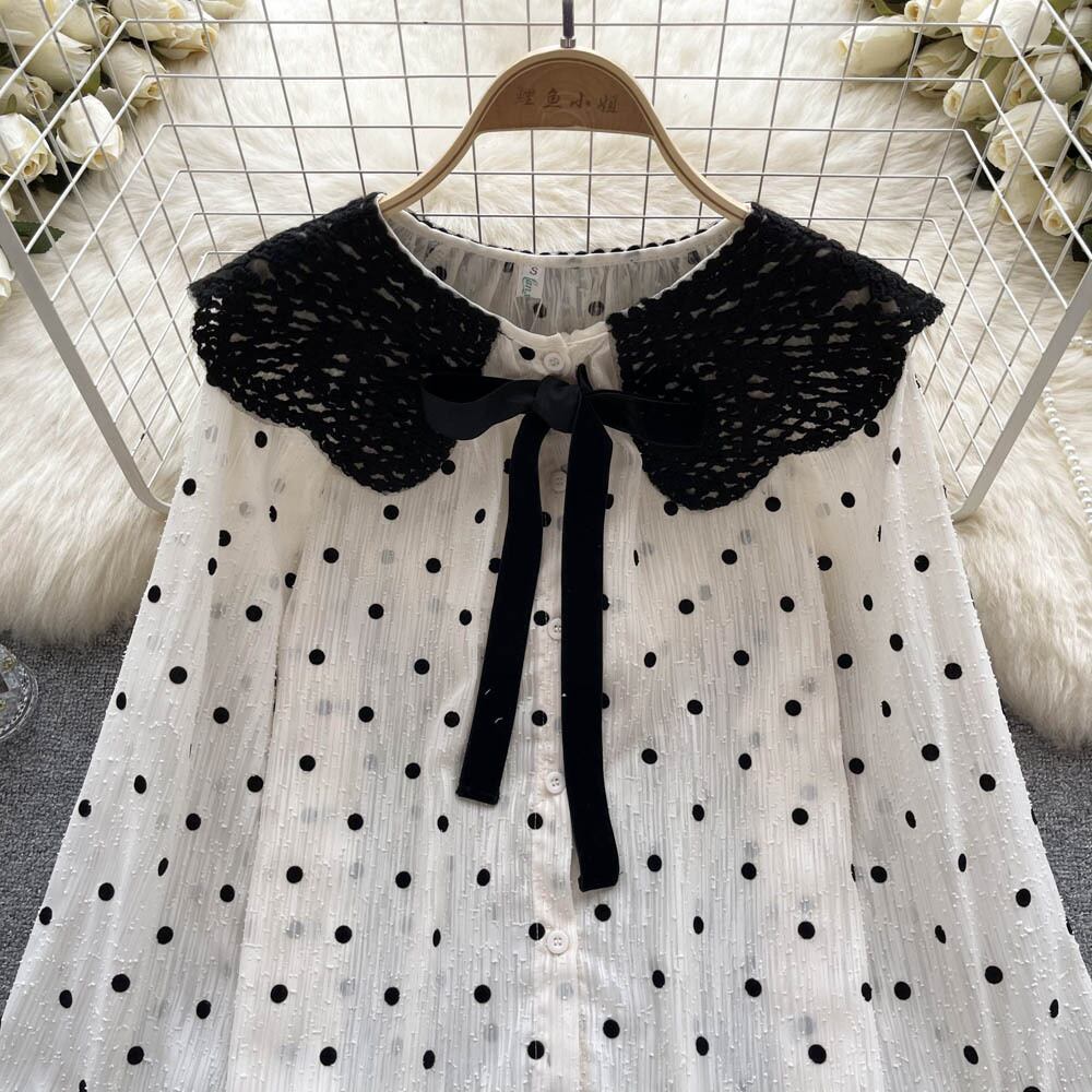 フランスのレトロな水玉の襟のコントラストカラーのシャツの女性の秋の新しいデザインの甘い弓のステッチのトップ リボン 大人ガーリー スウィート キュート カジュアル オータム 秋物 lyxaj51754389970