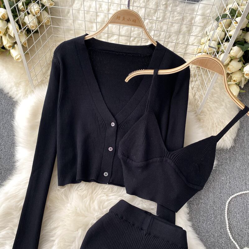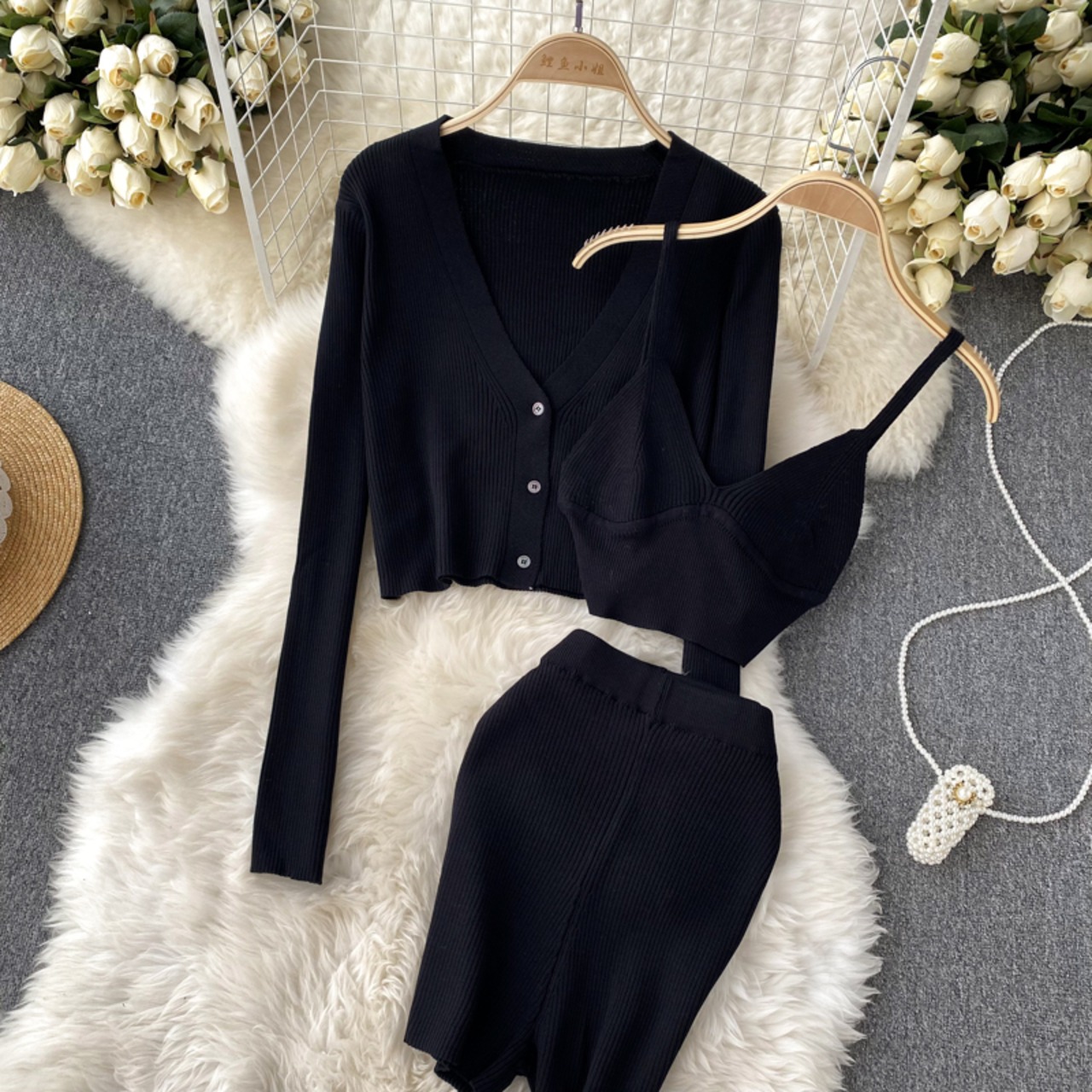 優しい風ファッションスーツ女性の秋新作ショートショートサスペンダー付きニットカーディガンバッグヒップショートパンツスリーピーススーツ オータム 秋物 lyxaj8145496148