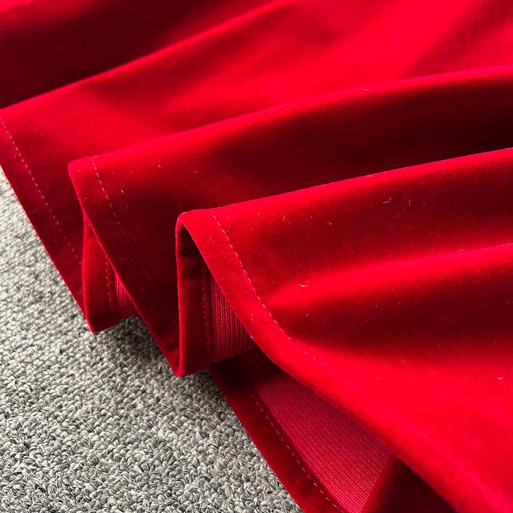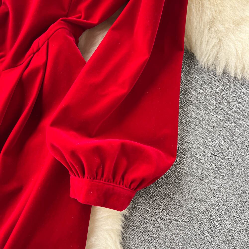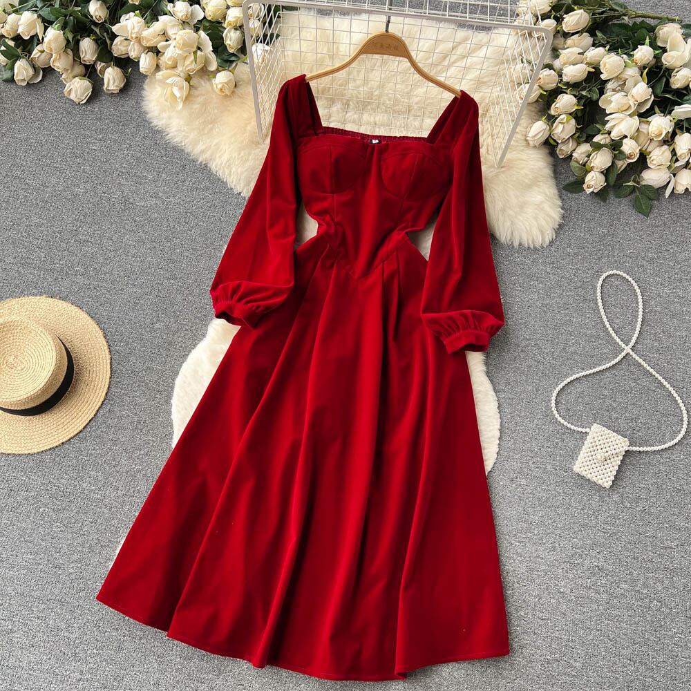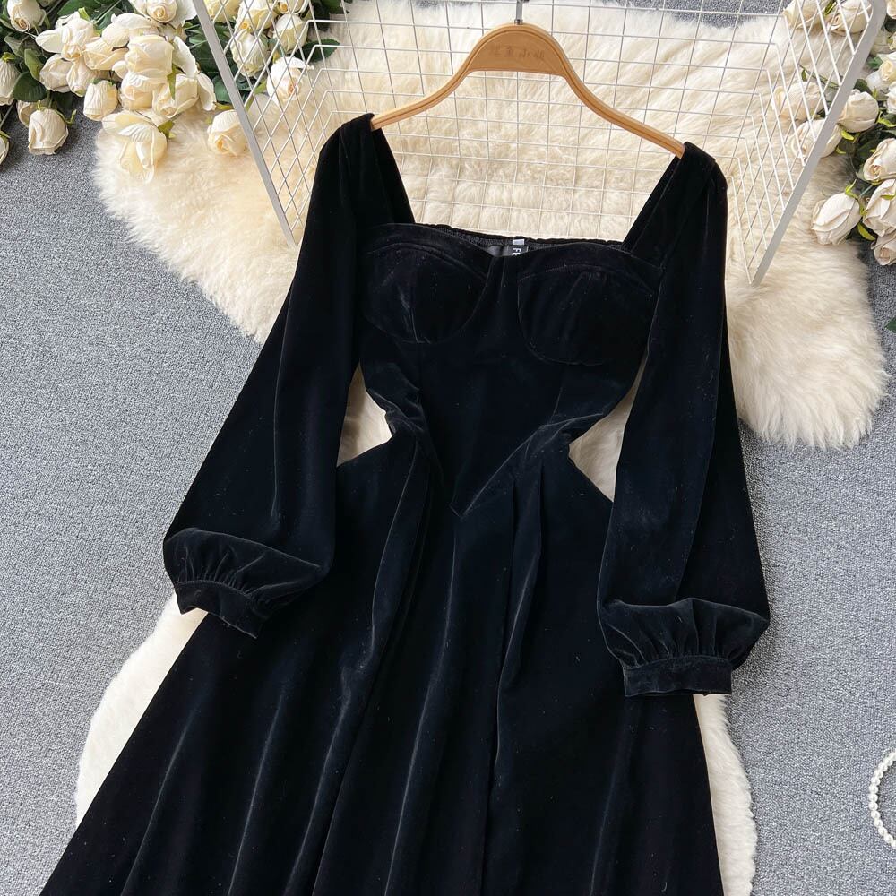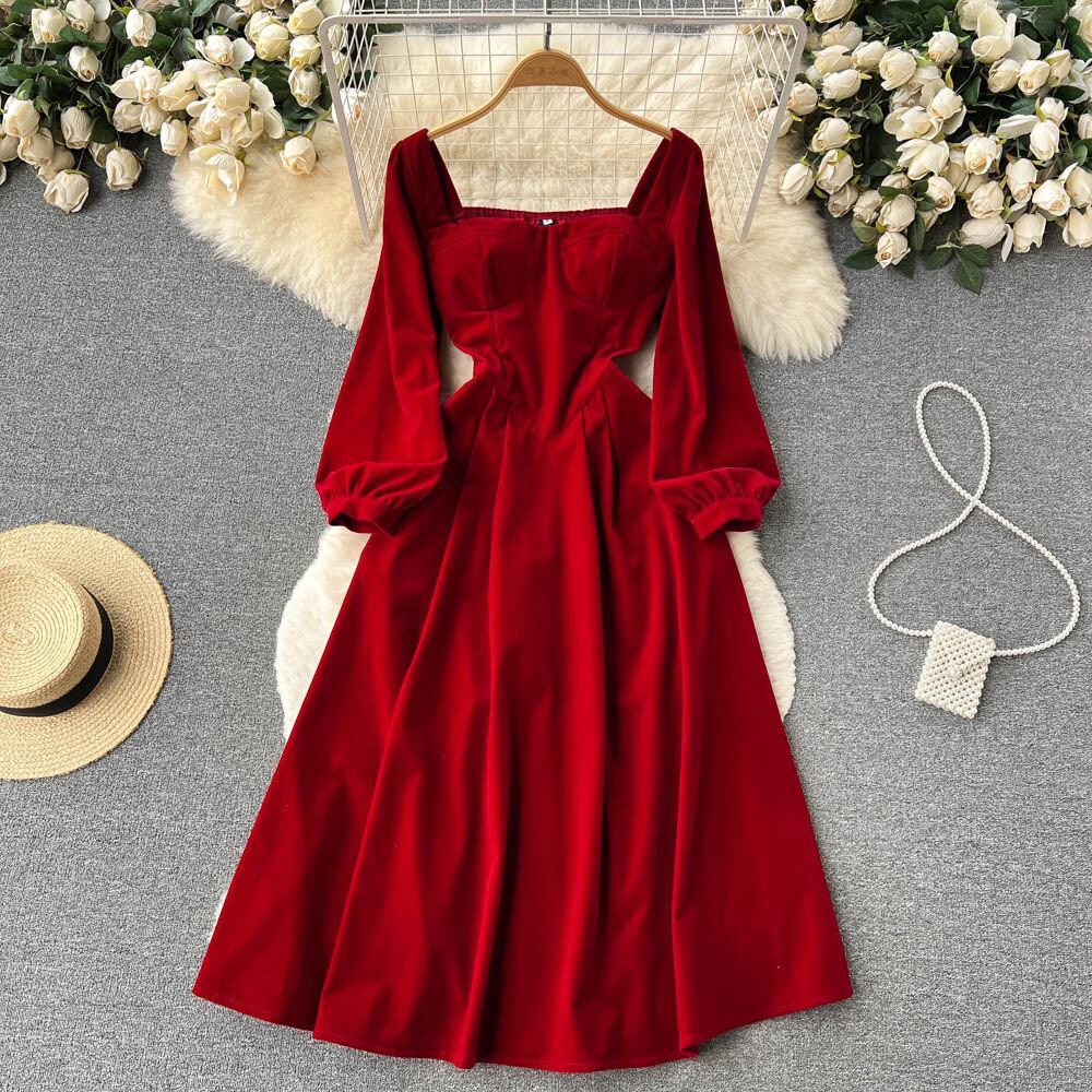 フランスのヘップバーンスタイルの長袖のスクエアカラーのベルベットのドレスの女性の秋と冬のオールマッチの気質ミッドレングスのプリンセススカート ロング オータム 秋物 ウィンター 冬物 スクウェア lyxaj84705982797