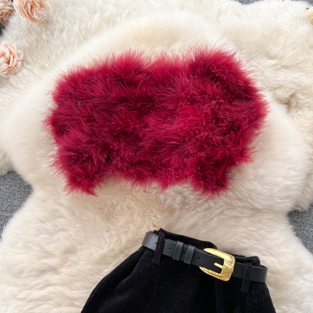 Pure Desire セクシー フラシ天 ショート チューブトップ + ウエストスリット コーデュロイ スカート ツーピース スーツ トレンディ lyxaj12643015185
