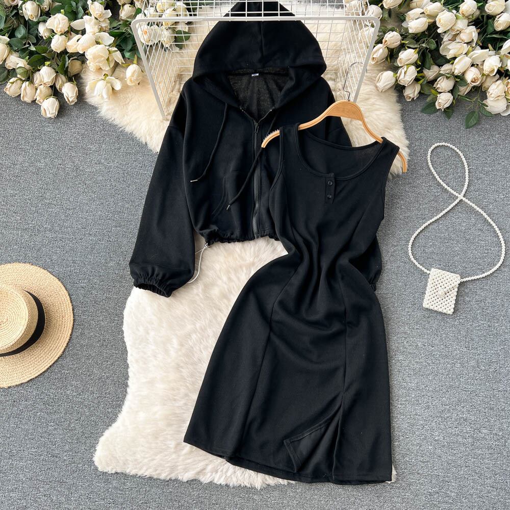 スポーツスーツ レディース 秋 カーディガン ジャケット ショート フード付き セーター ノースリーブ キャミソール ドレス 2点セット オータム 秋物 lyxaj98999710158
