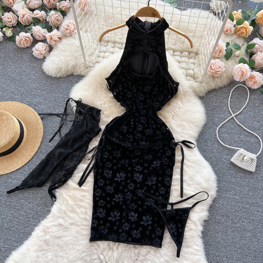 夏新セクシーなレース中空ぶら下げネックスリットネクタイミッドレングスバッグヒップ刺繍ジャカードチャイナドレス サマー 夏物 lyxaj46882291297