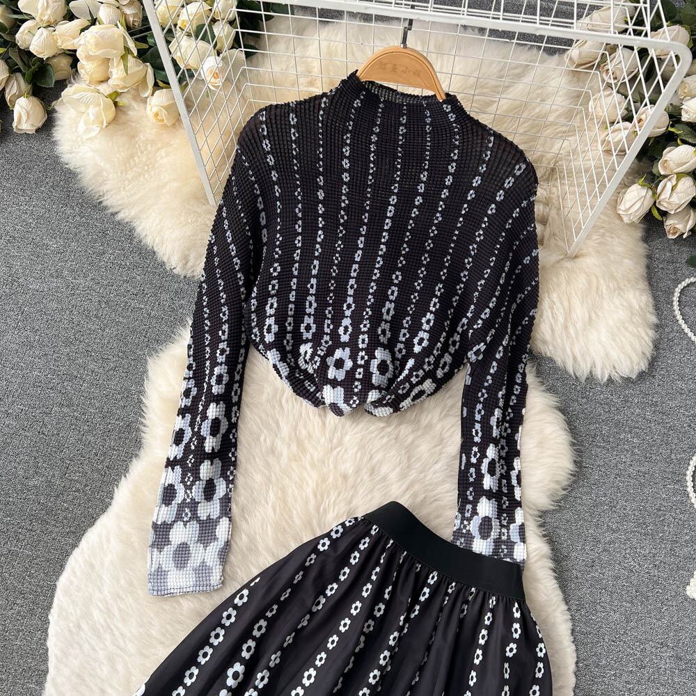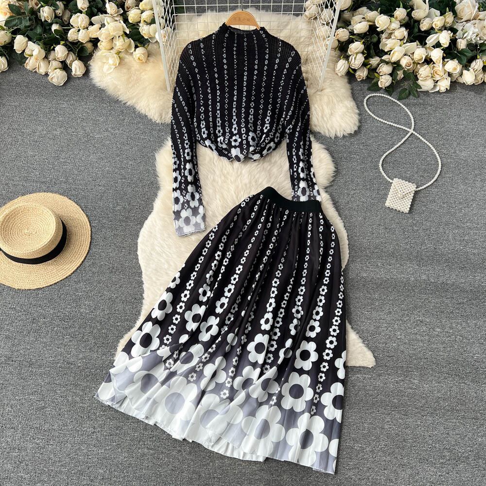 ヨーロッパとアメリカのスタイルの秋の服のグラデーションプリントスーツの女性のラウンドネックのセーター+ミドル丈のプリーツスカートの2点セット オータム 秋物 Oネック ヨーロピアン lyxaj39151215085