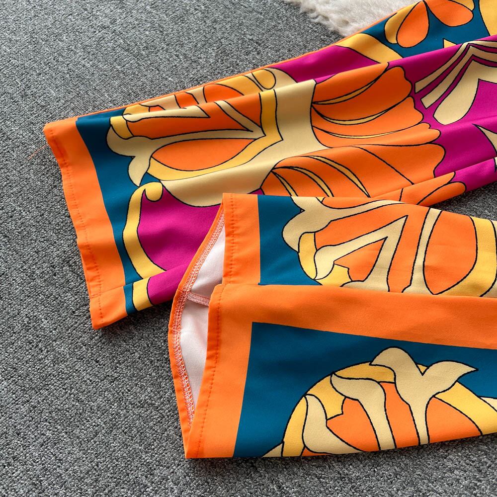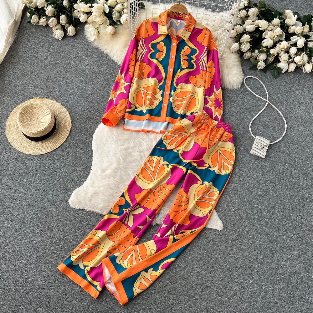 欧米インスタイルレトロ個性プリントスーツレディースラペルシックシャツ+ドレープワイドレッグロングパンツ2点セット ヨーロピアン lyxaj4461489631