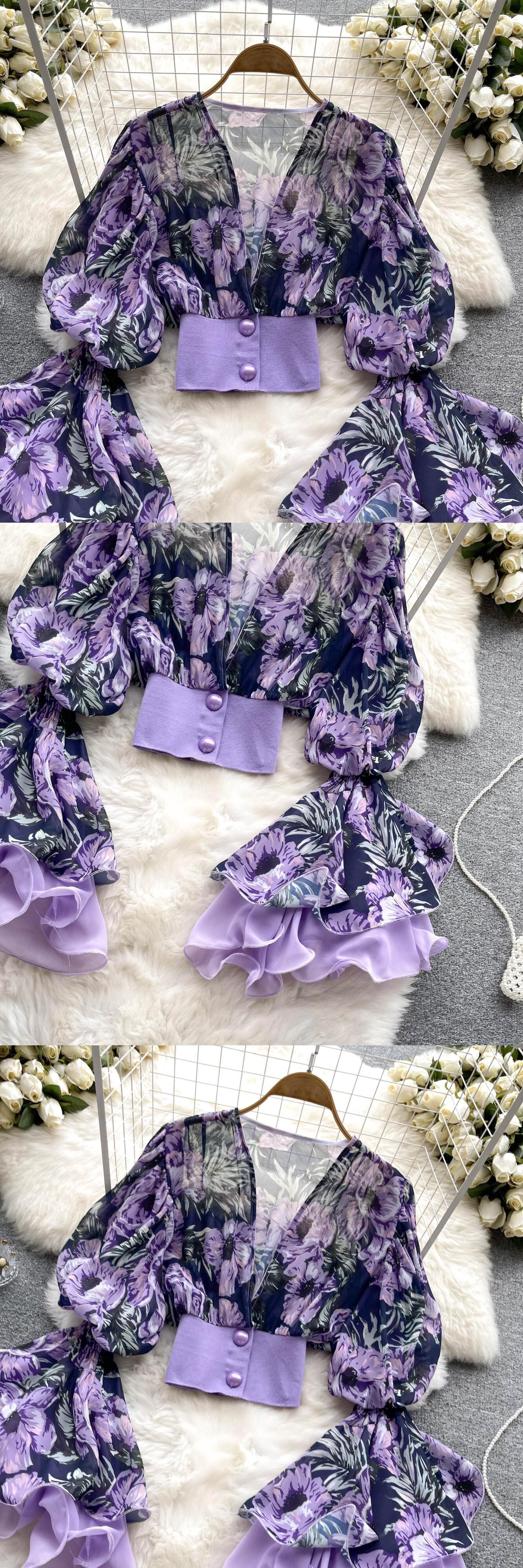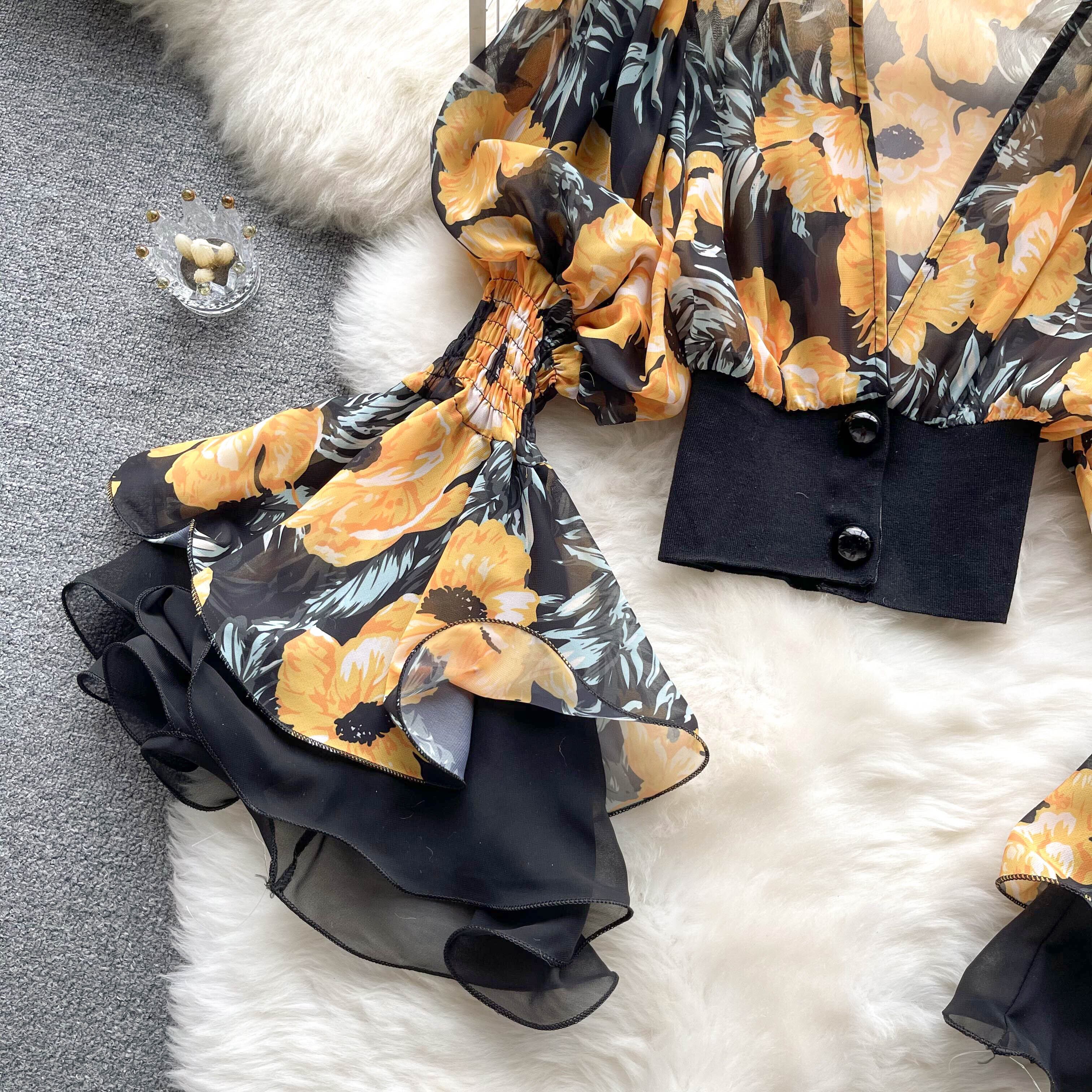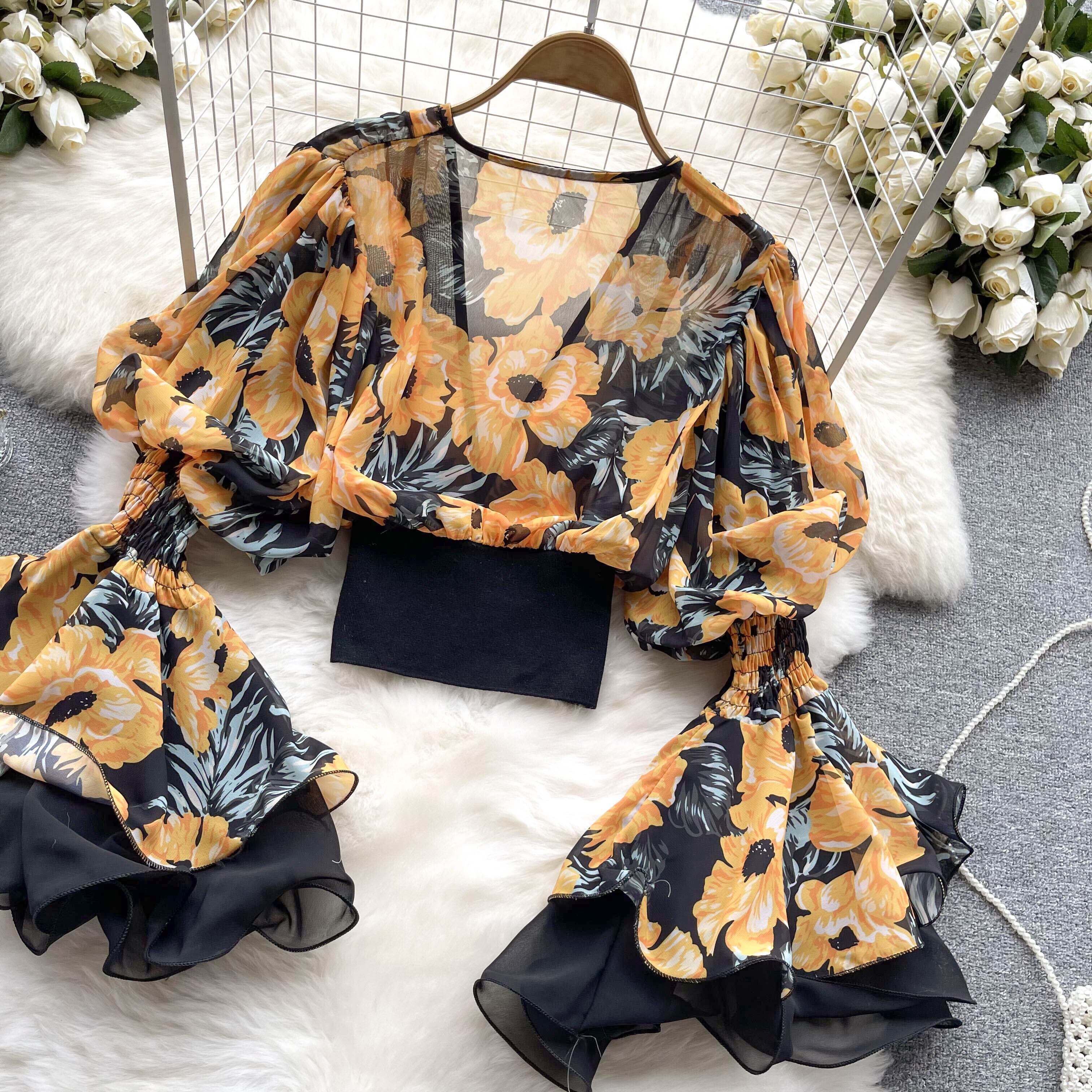 フレンチデザインセンスニッチ気質有名人トランペットスリーブシャツトップ秋の新プリント eign スタイルシフォンシャツ女性 オータム 秋物 lyxaj87102149989