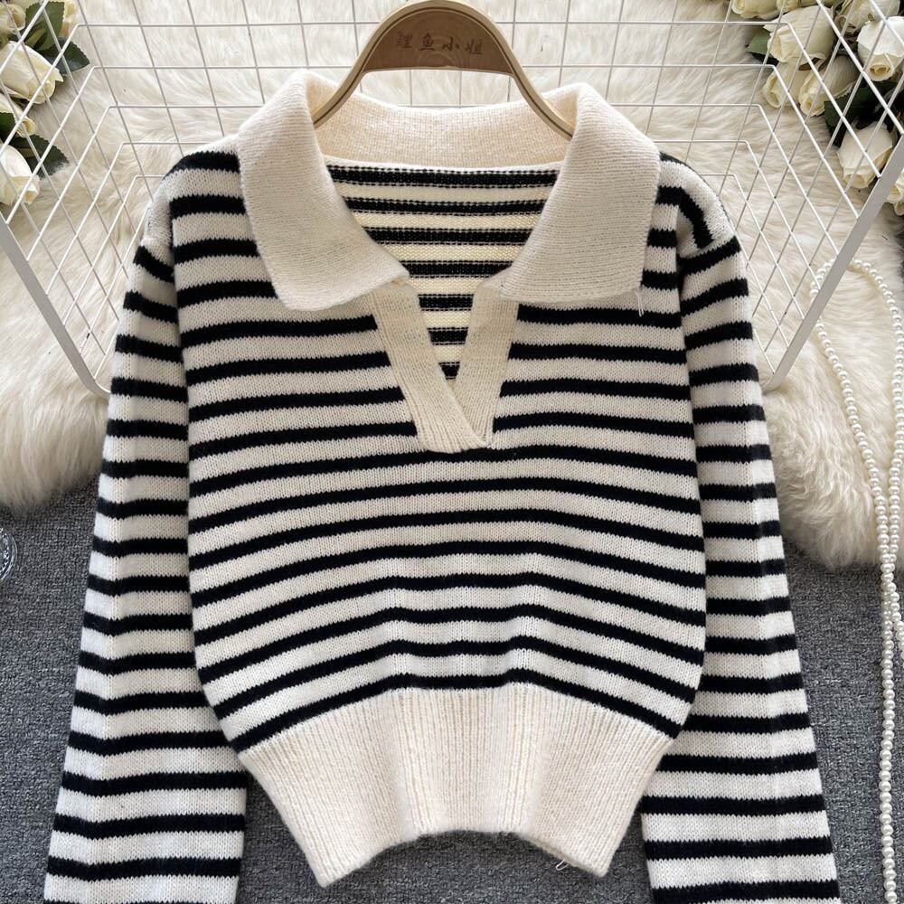 2022 秋冬新作ポロ襟レインボーストライプくり抜き長袖セーターニットセーターシックなトップトレンド ロング オータム 秋物 ウィンター 冬物 lyxaj22738007380