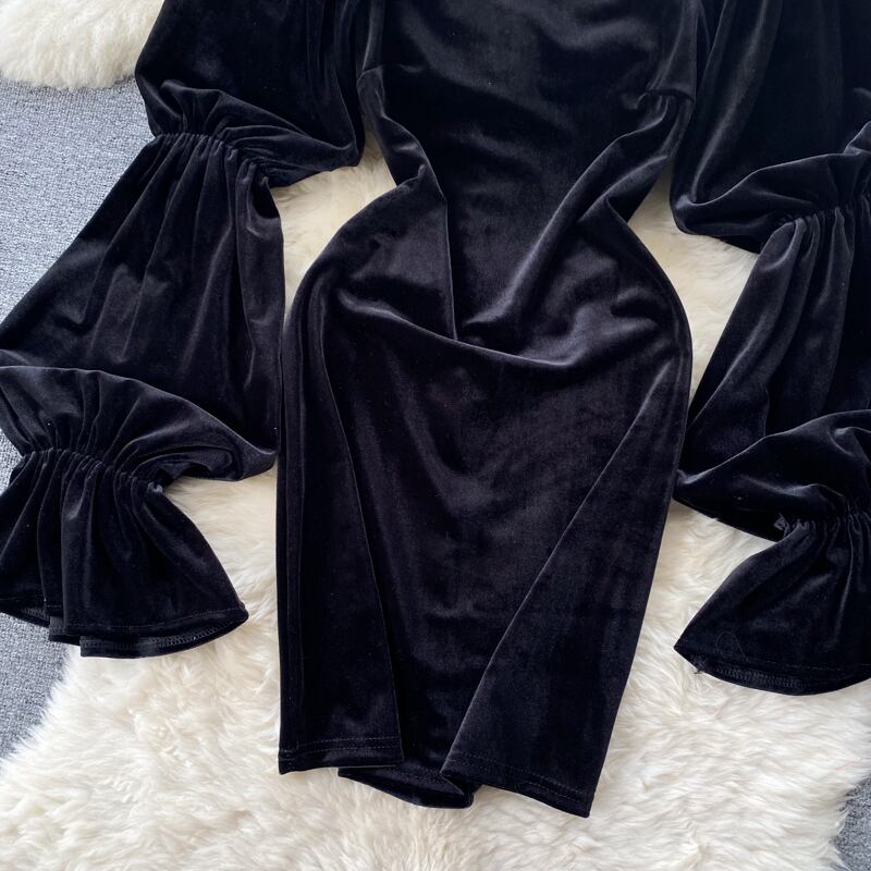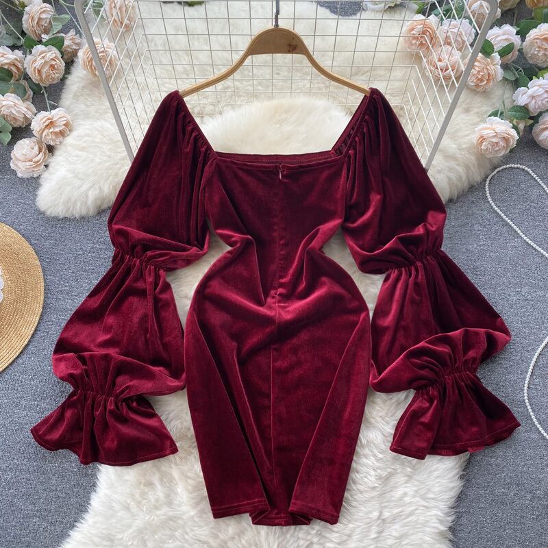 スタイル秋と冬ランタン スリーブ デザイン ドレス女性ベルベット スクエア カラー レトロ バッグ ヒップ セクシー スカート潮 ランタンスリーブ オータム 秋物 ウィンター 冬物 スクウェア lyxaj4791073018