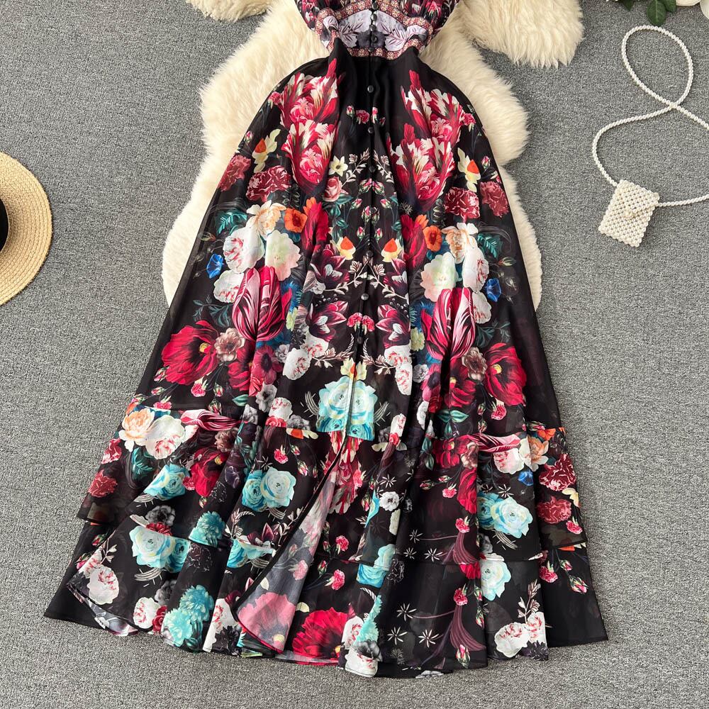 夏甘い民族スタイル レトロな深い V ネック木耳ノースリーブ プリント ドレス女性ケーキ妖精ロング スカート 大人ガーリー スウィート キュート カジュアル サマー 夏物 Vネック lyxaj56855855582