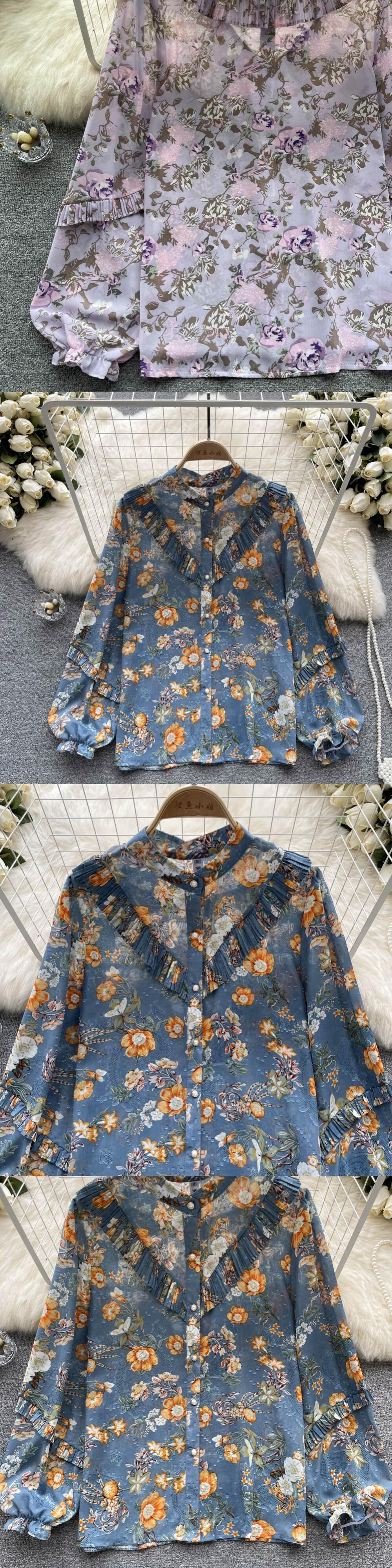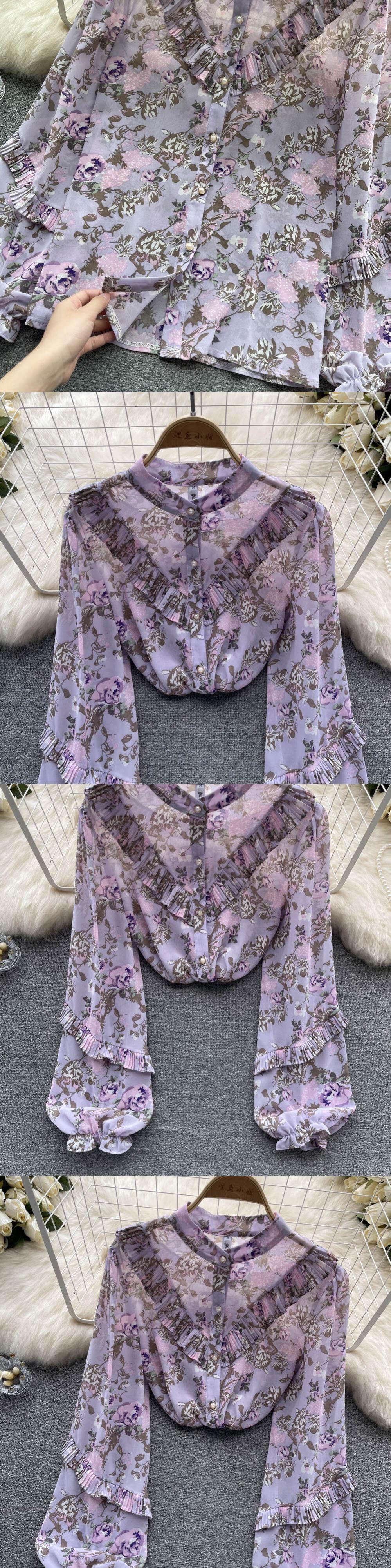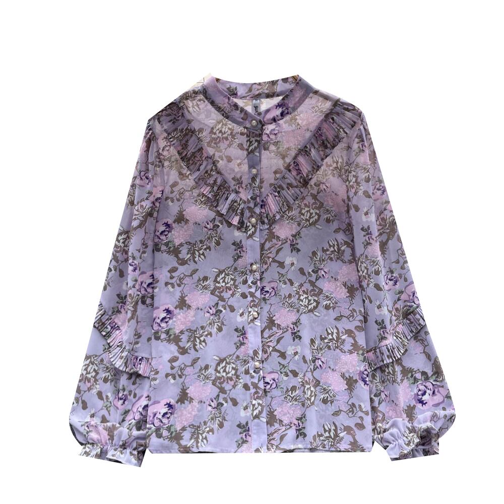 秋の新スタイル立ち襟シングル ブレスト甘い花柄シフォン シャツ女性のトレンディな木耳パフ スリーブ シャツ トップ 大人ガーリー スウィート キュート カジュアル オータム 秋物 lyxaj66671530991