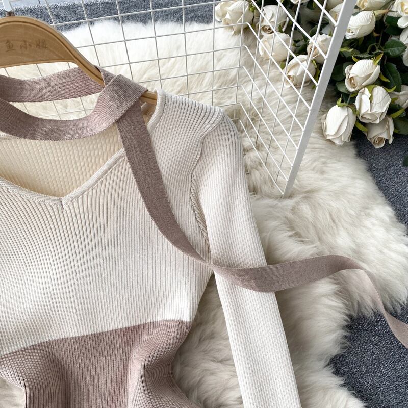 秋と冬の新しい配色ショー薄いバッグ ヒップ マーメイド ドレス女性 V ネック長袖スリット セクシーなロング スカート リボン付き オータム 秋物 ウィンター 冬物 Vネック lyxaj36187406859