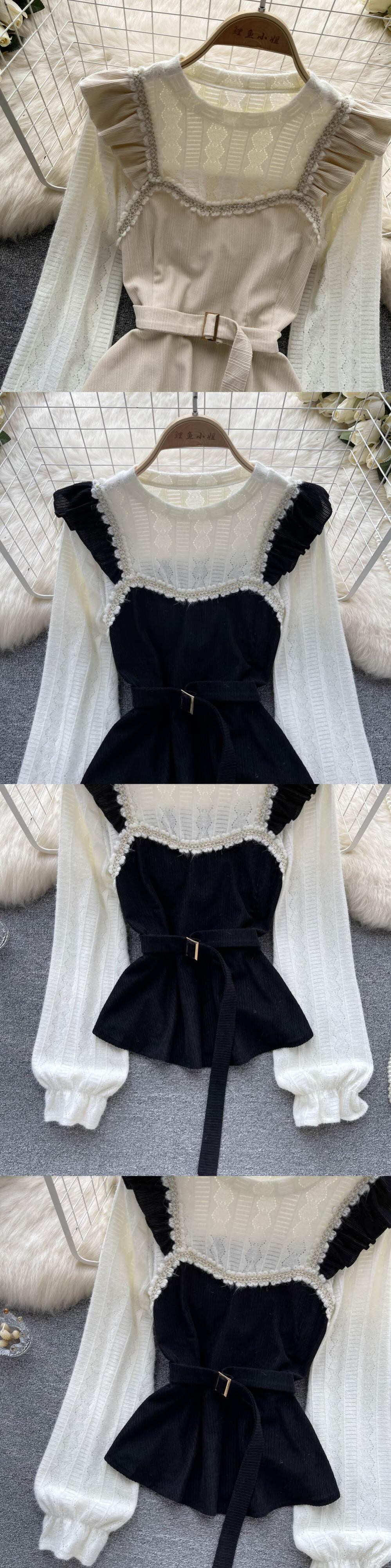 秋の新製品スプライシング中空レースシャツ女性のスリムで薄い短い長袖フリルウエスト甘いシャツトレンディ ショート ロング 大人ガーリー スウィート キュート カジュアル オータム 秋物 lyxaj92493852083