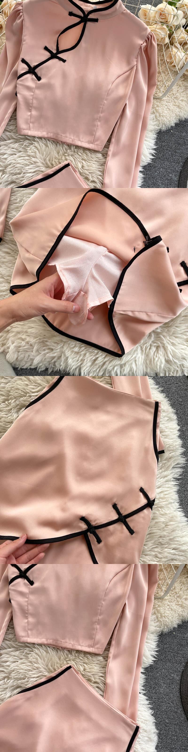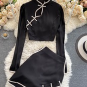 レトロな中国風のチャイナ ドレス スーツ女性の秋の新しい短い長袖ボタン トップ + A ワード バッグ ヒップ スカート 2 点セット ショート ロング オータム 秋物 lyxaj61314687158