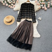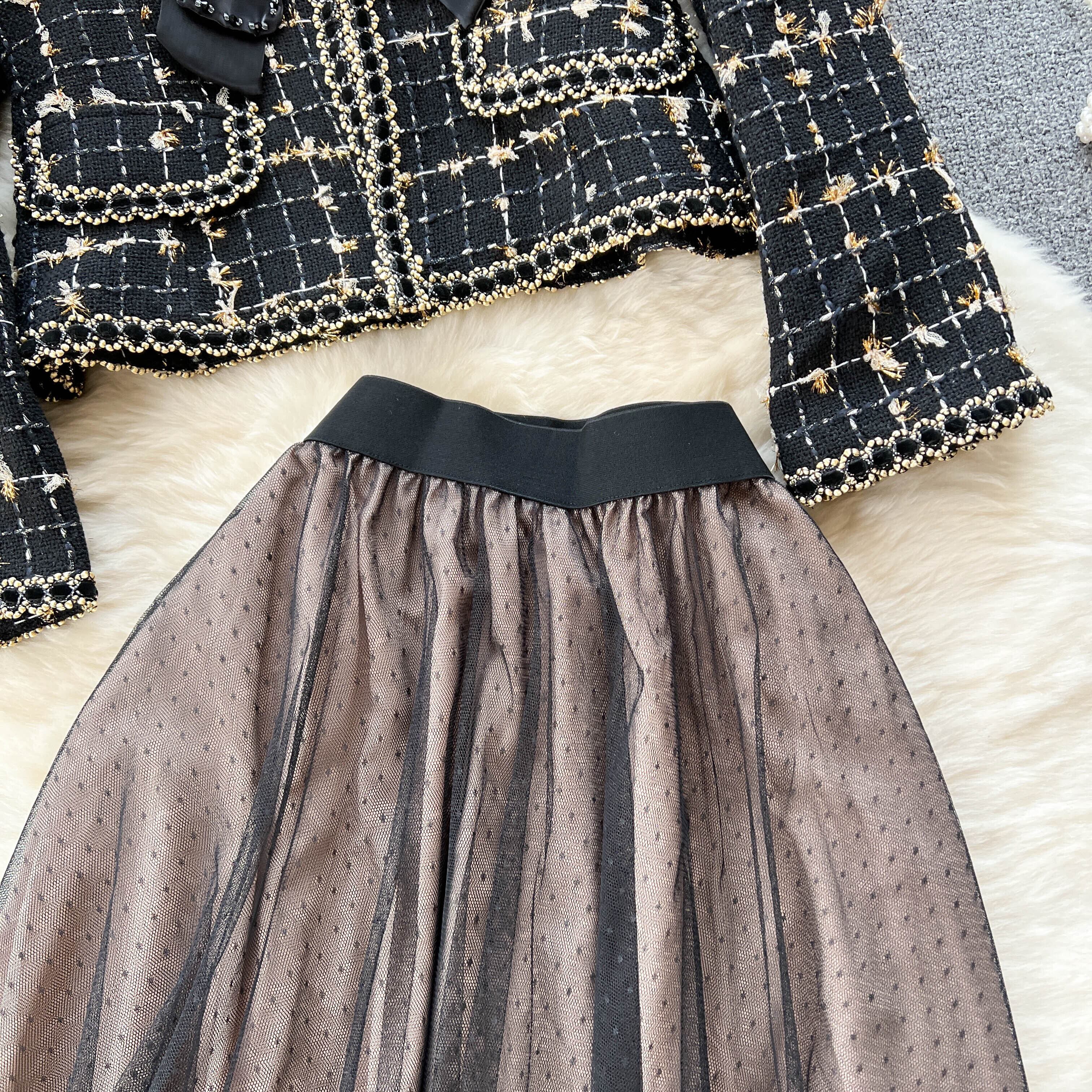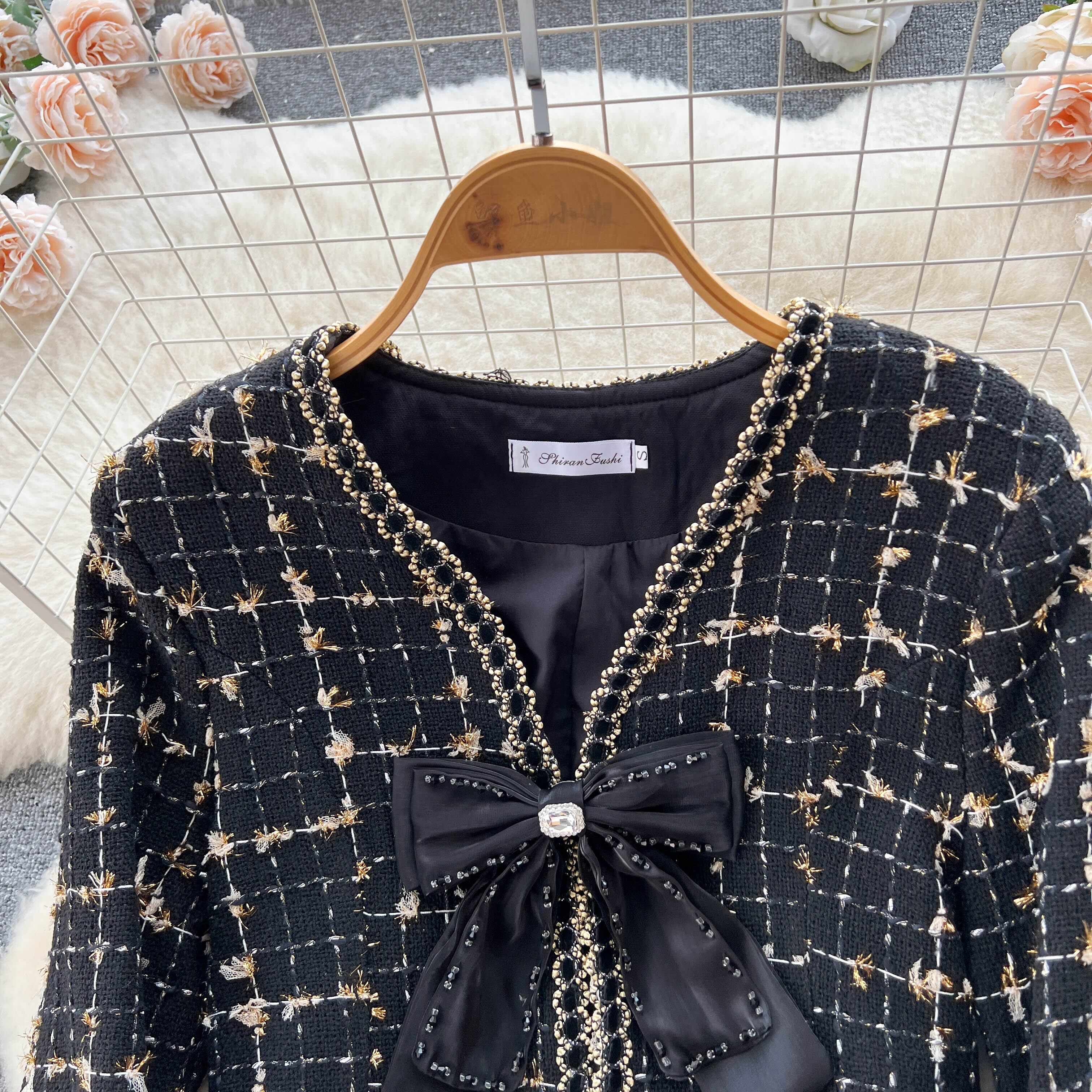 ライトクックスモールドレス秋冬スモールフレグランススーツレディースVネックちょう結びウールコート+メッシュスカート2点セット リボン オータム 秋物 ウィンター 冬物 lyxaj48988381493