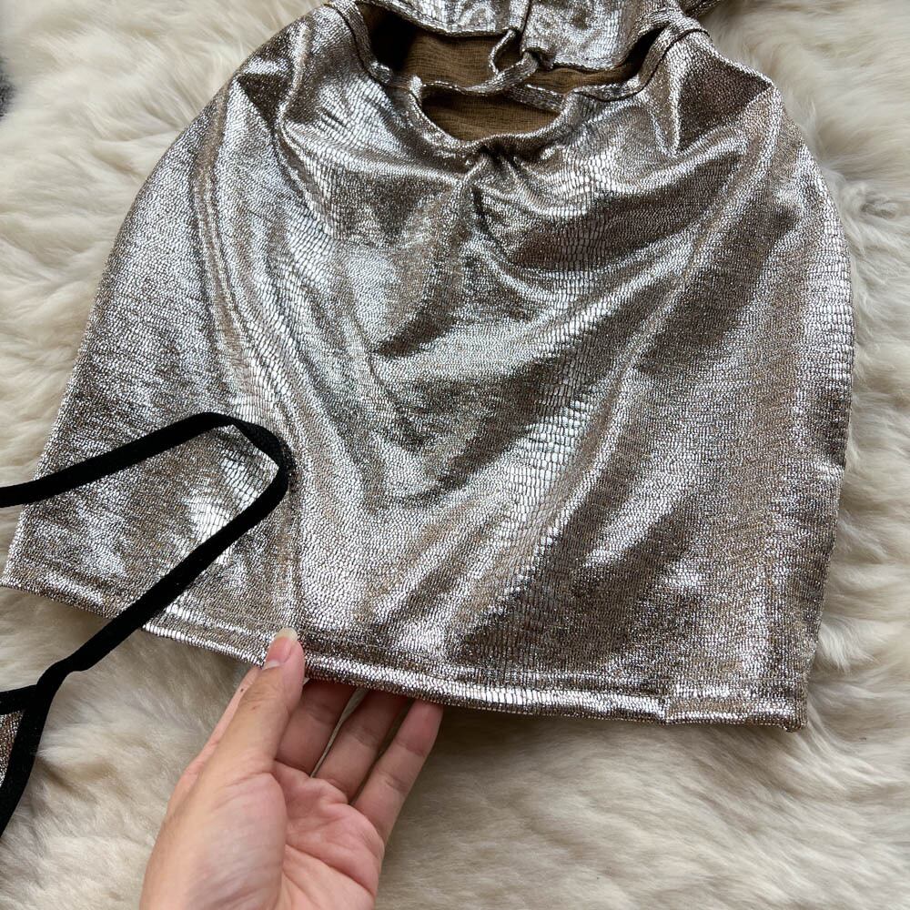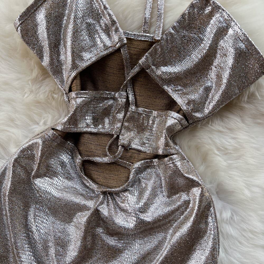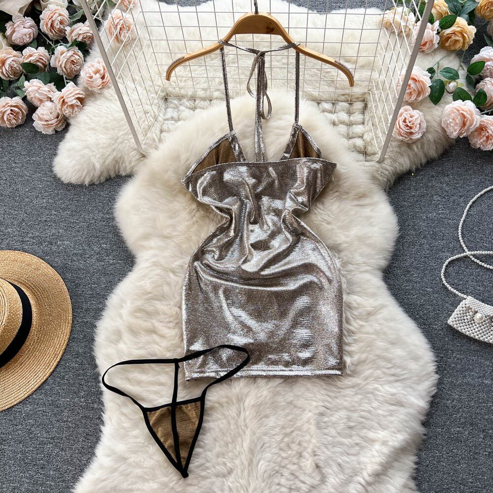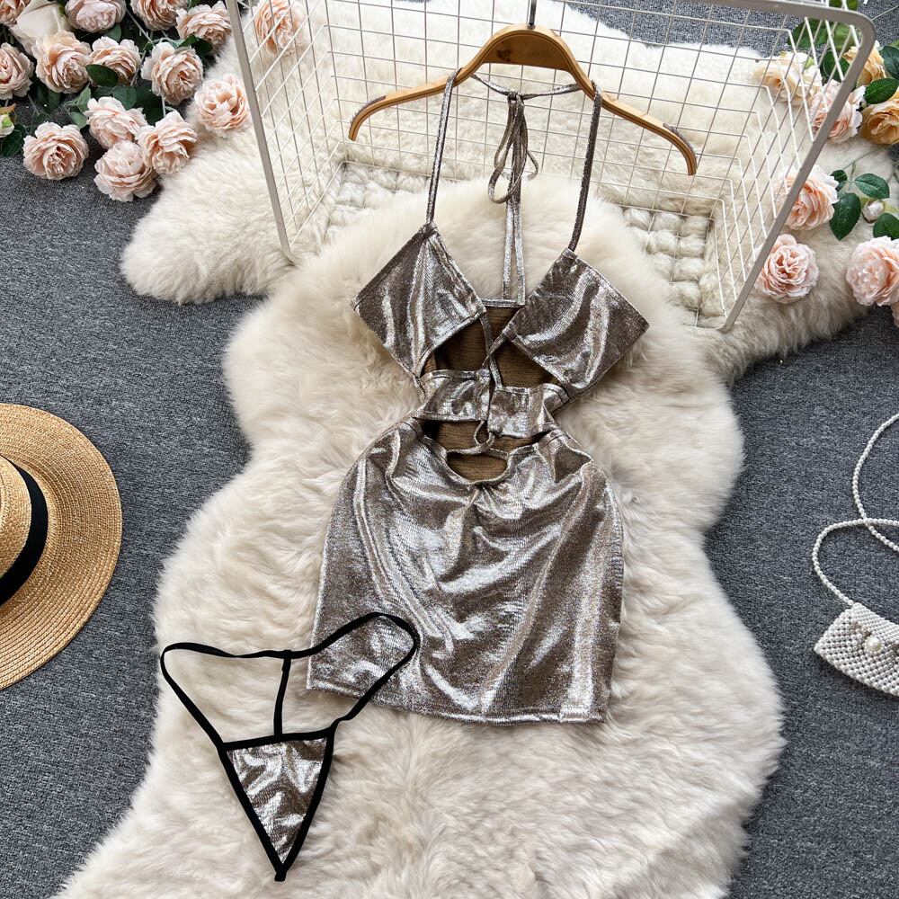 夏新セクシーな巾着タイストラップホルターネックバックレスゴールドシルクバッグヒップドレス女性ウエスト中空アウトスカート サマー 夏物 lyxaj25805974061