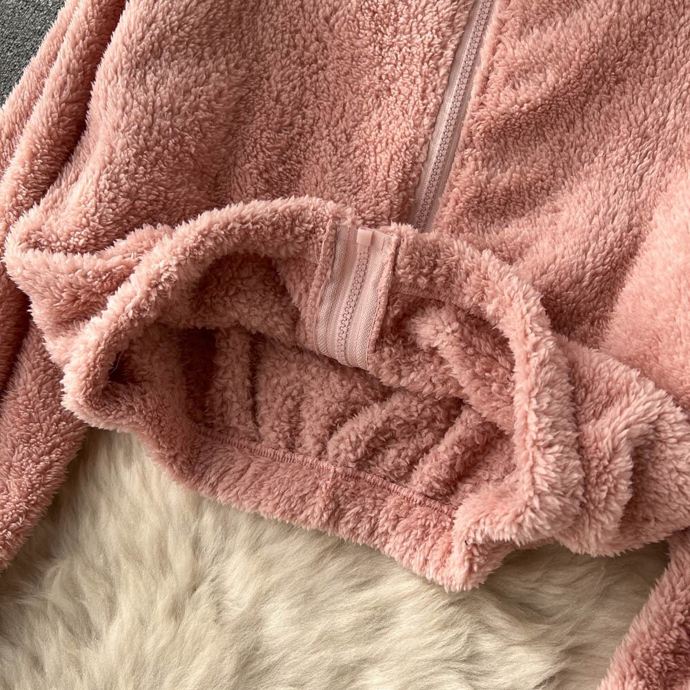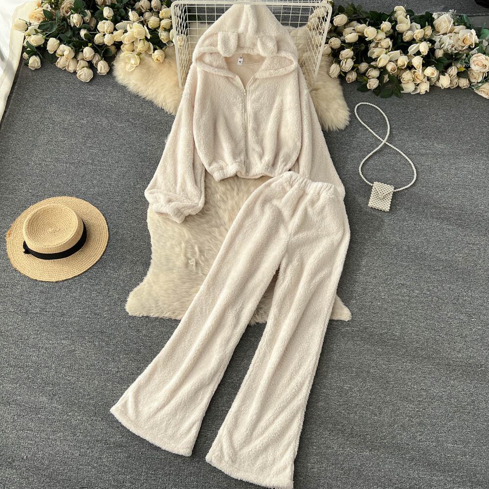 秋と冬のカジュアルなラムウールのスーツの女性の怠惰なゆったりとした長袖のフード付きジャケット+ストレートワイドレッグパンツの2点セット ロング オータム 秋物 ウィンター 冬物 lyxaj51865537673