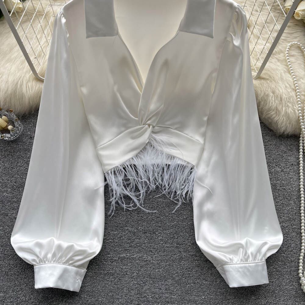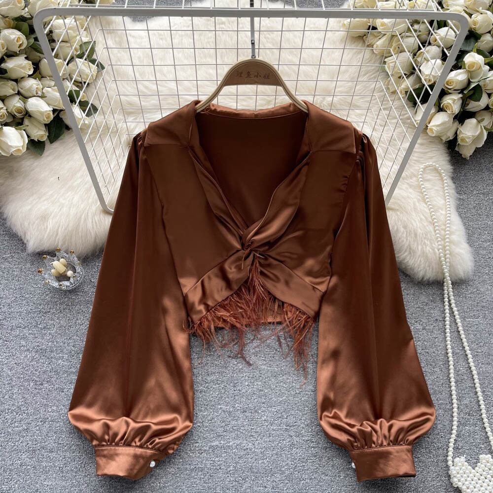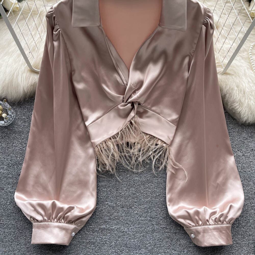 春秋スタイル クロス 深め Vネック サテンシャツ レディース デザインセンス ニッチテル 短め おへそ 長袖シャツ ショート ロング スプリング 春物 オータム 秋物 lyxaj21377858334