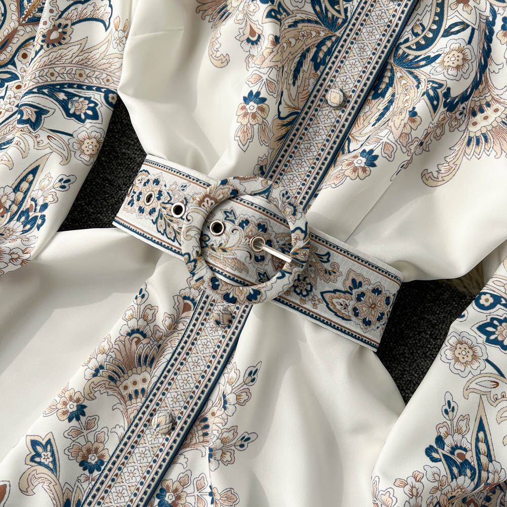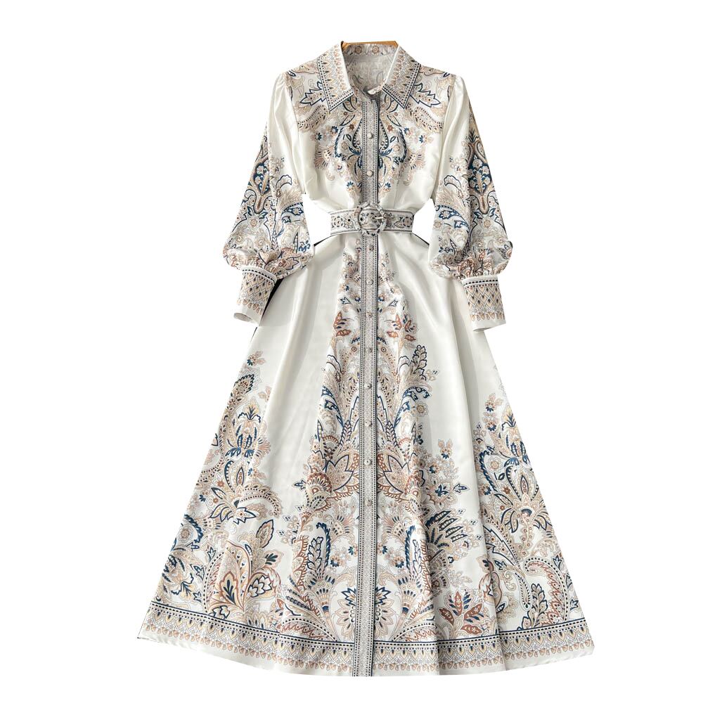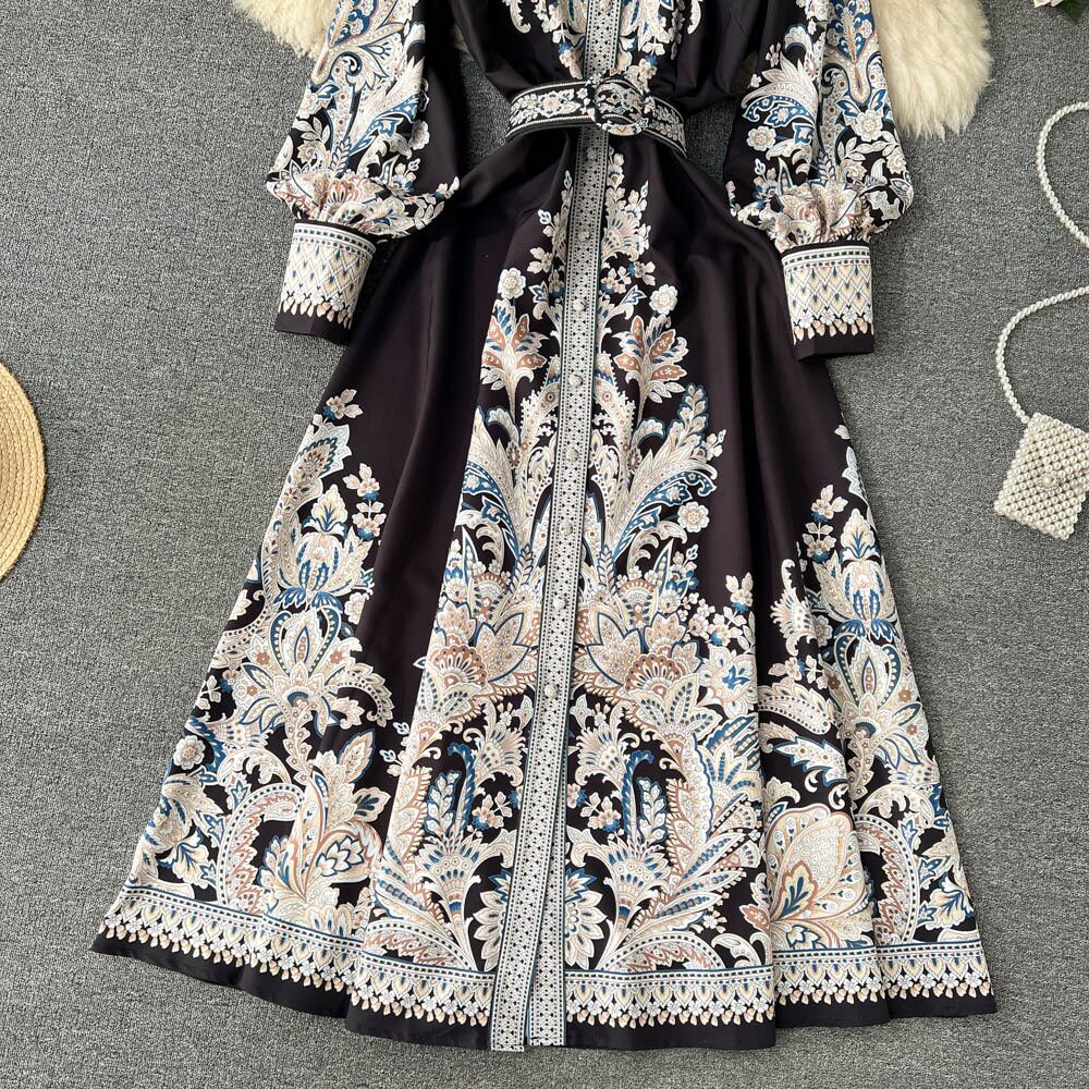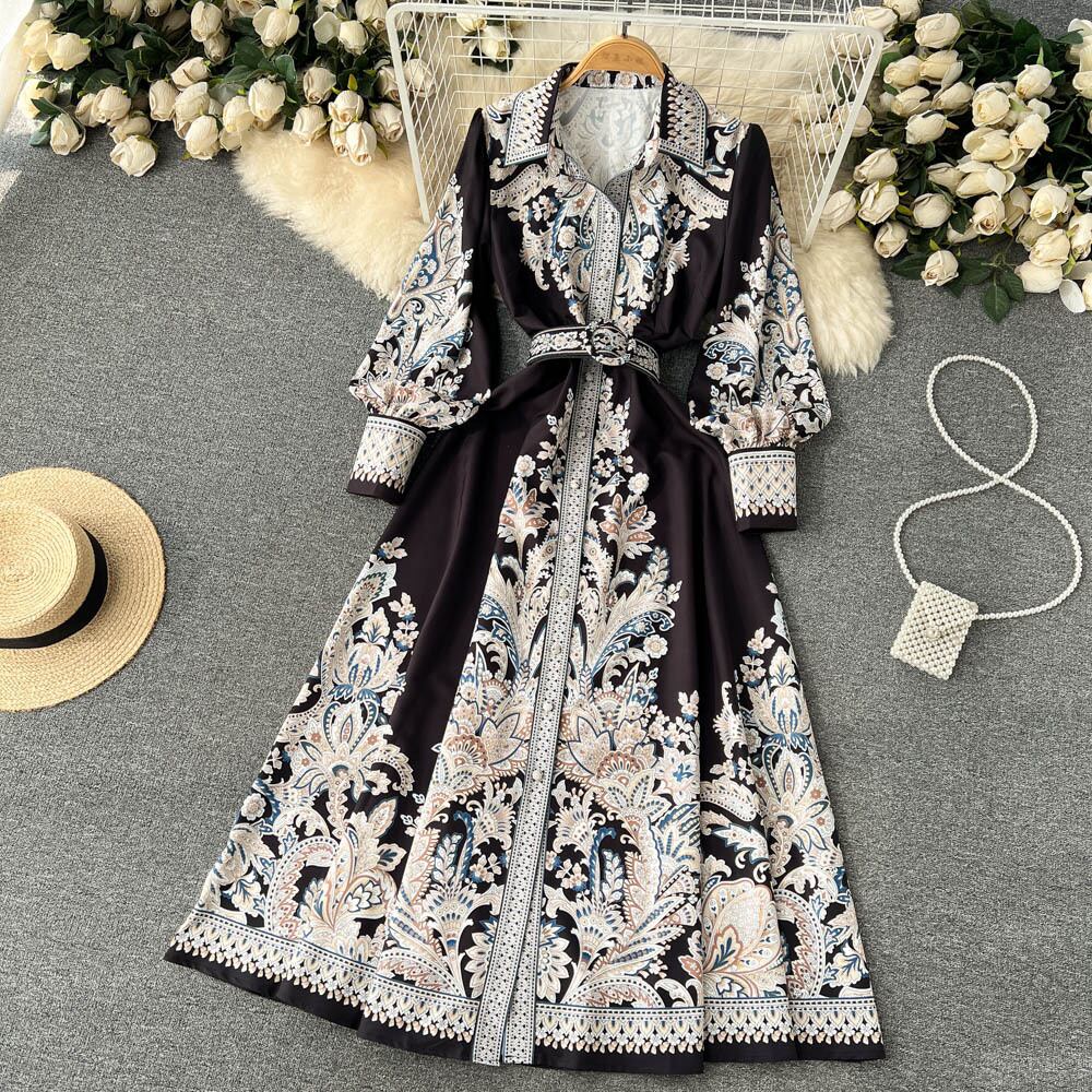 春秋新作ランタンスリーブラペルシングルブレストボタンプリントワンピレディースウエストウエスト大振りコート風ロングスカートトレンド スプリング 春物 オータム 秋物 lyxaj1565873375