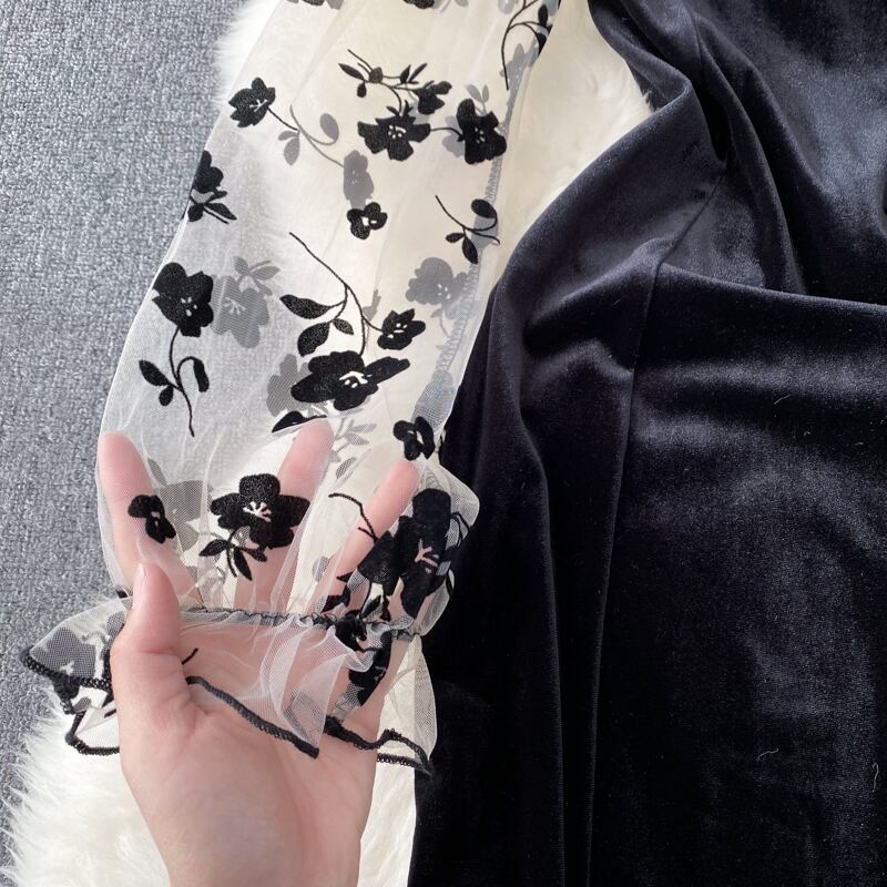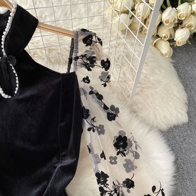 秋と冬の新しいファッション メッシュ長袖ステッチ吊りネック中空バッグ ヒップ スリット ベルベット チャイナ ドレス リトル ブラック ドレス ロング オータム 秋物 ウィンター 冬物 lyxaj92278180109