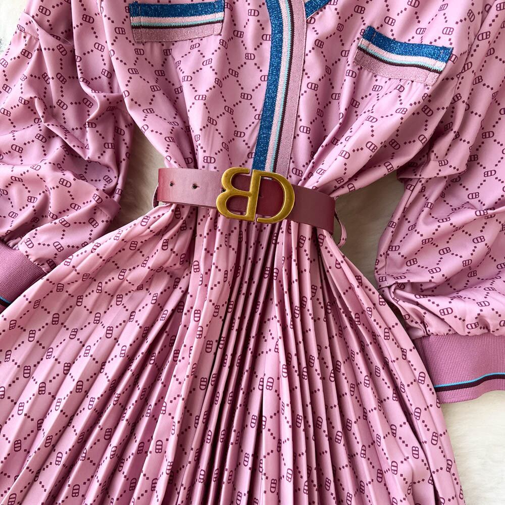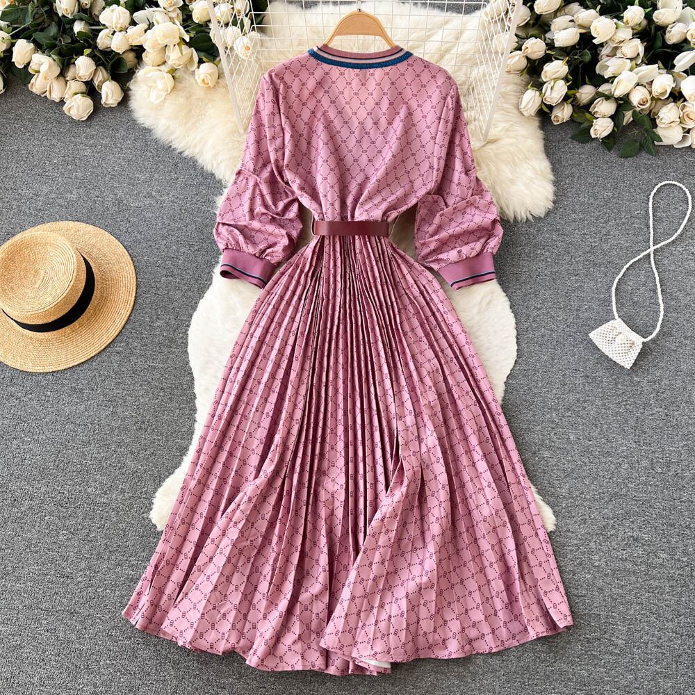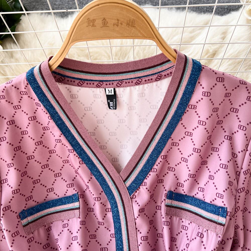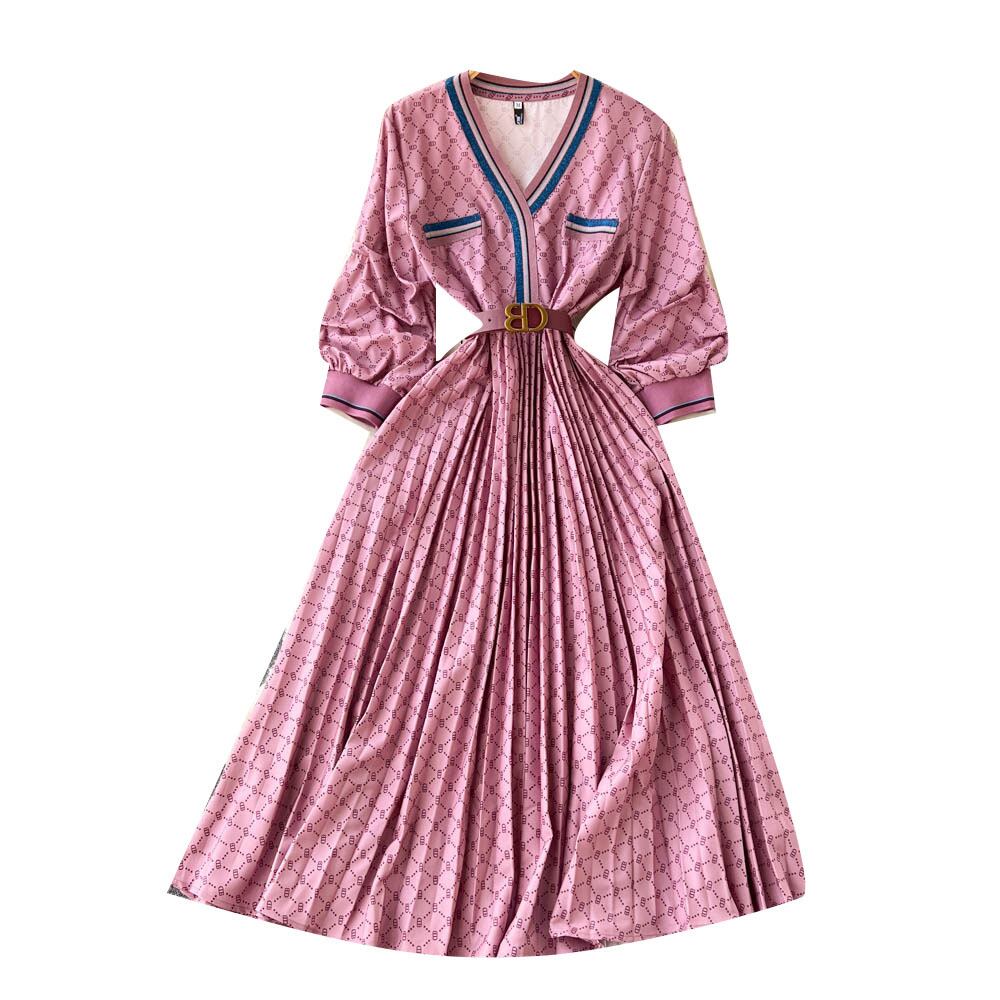 2022 秋の新ライトおなじみのスタイルファッション印刷 V ネックスプライシングプリーツコントラストカラードレス女性のビッグスイングロングスカート オータム 秋物 Vネック lyxaj28874724966