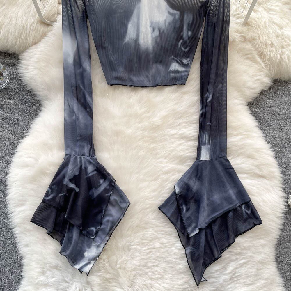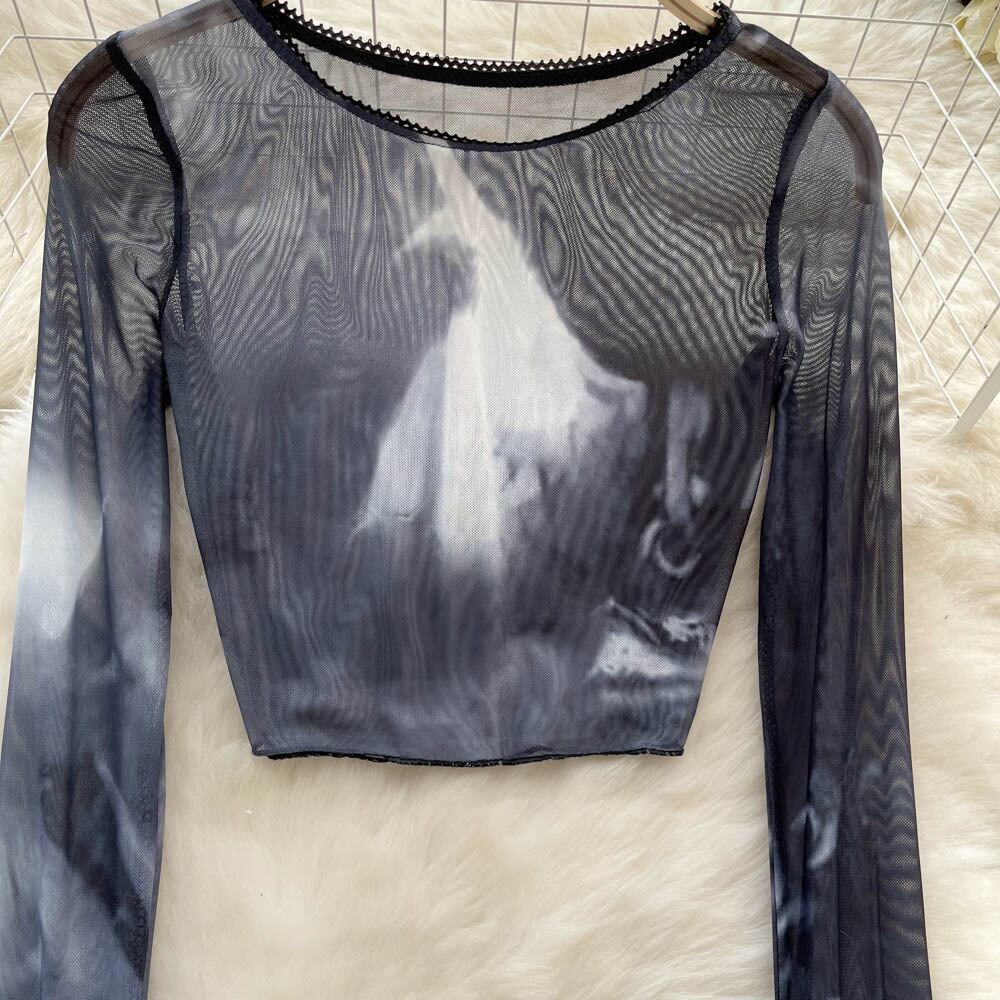 センス 欧米 長袖 ショート メッシュ Tシャツ レディース デザイン センス イレギュラー ロングスリーブ エインスタイル プリント トップス ヨーロピアン lyxaj11235424891