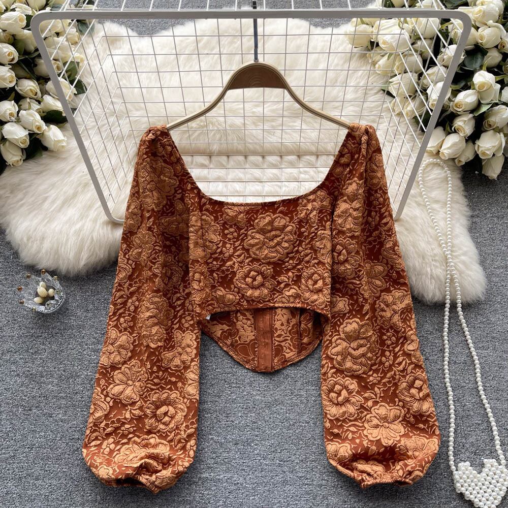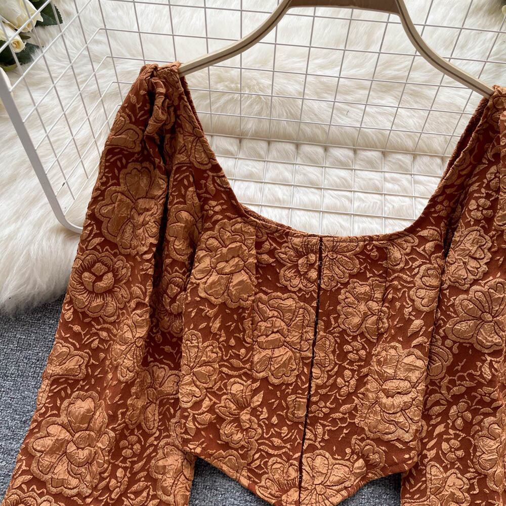 シックな秋宮廷風レトロ気質スクエアカラーパフスリーブトップ女性フックフラワー刺繍デザインセンススモールシャツ オータム 秋物 フラワーデザイン スクウェア lyxaj82287122163