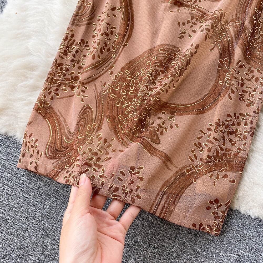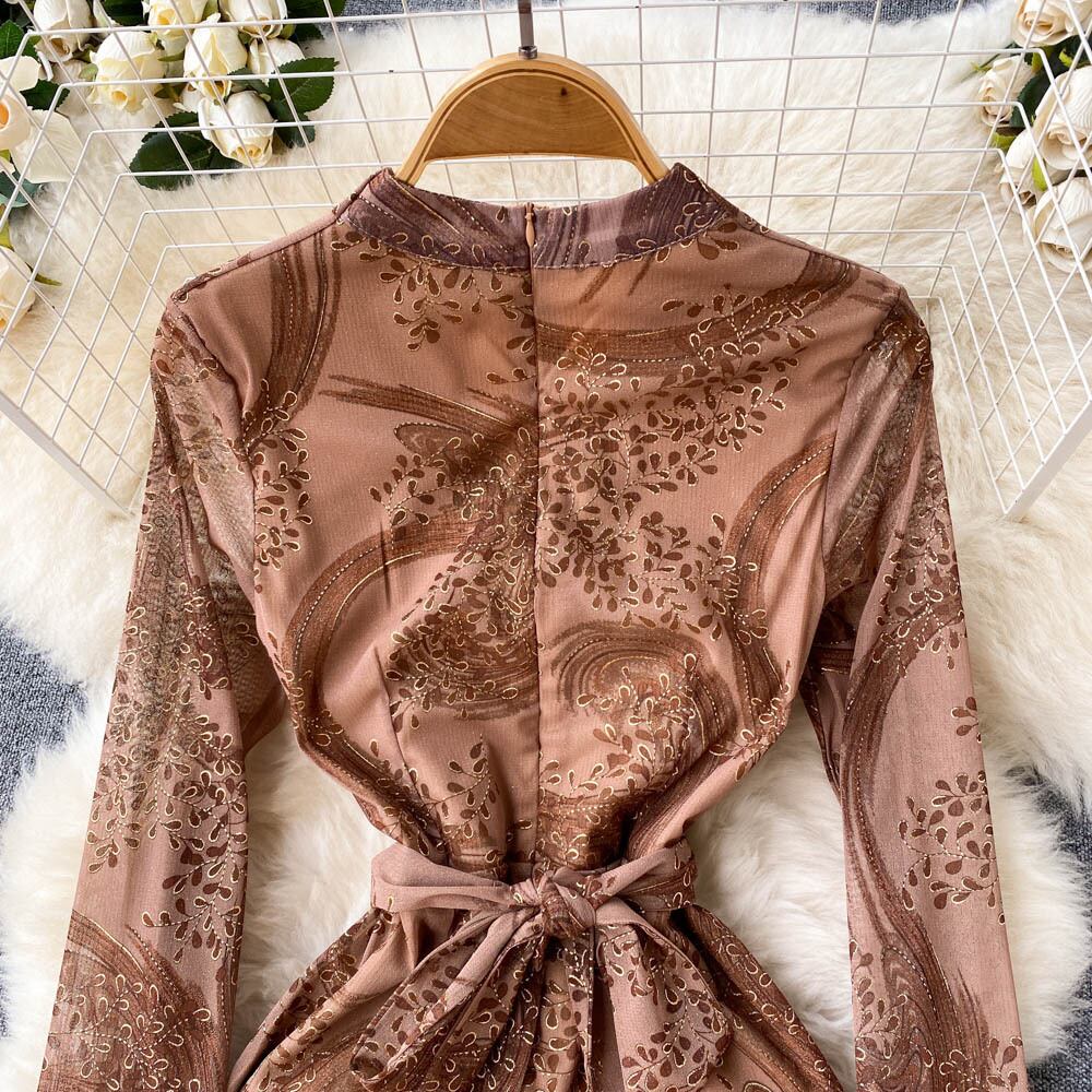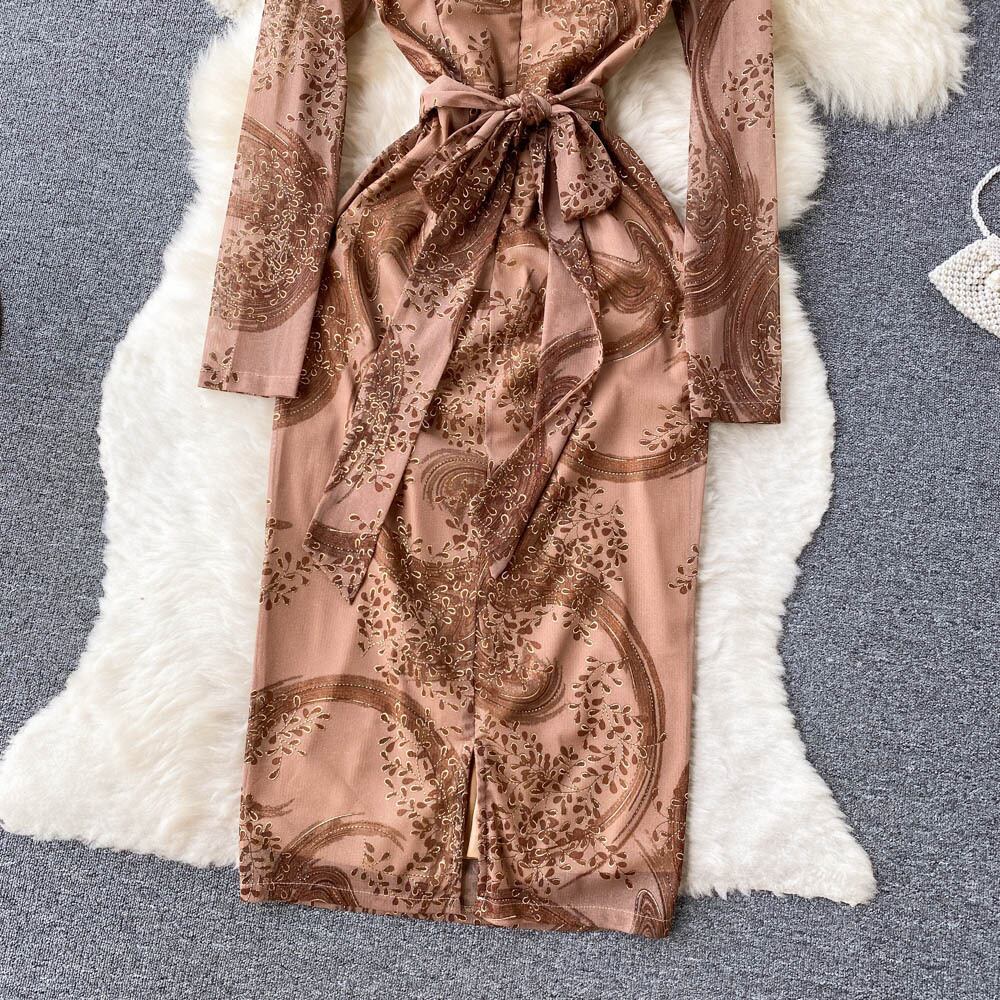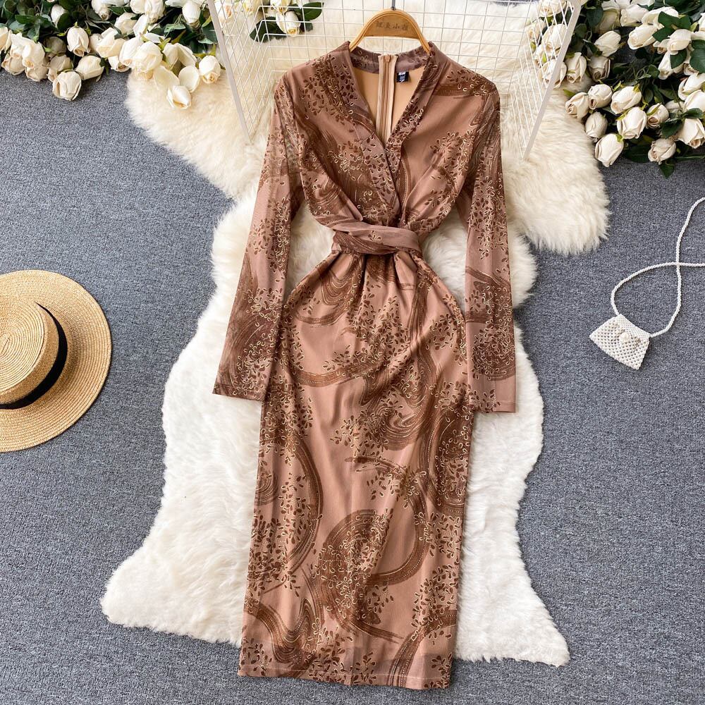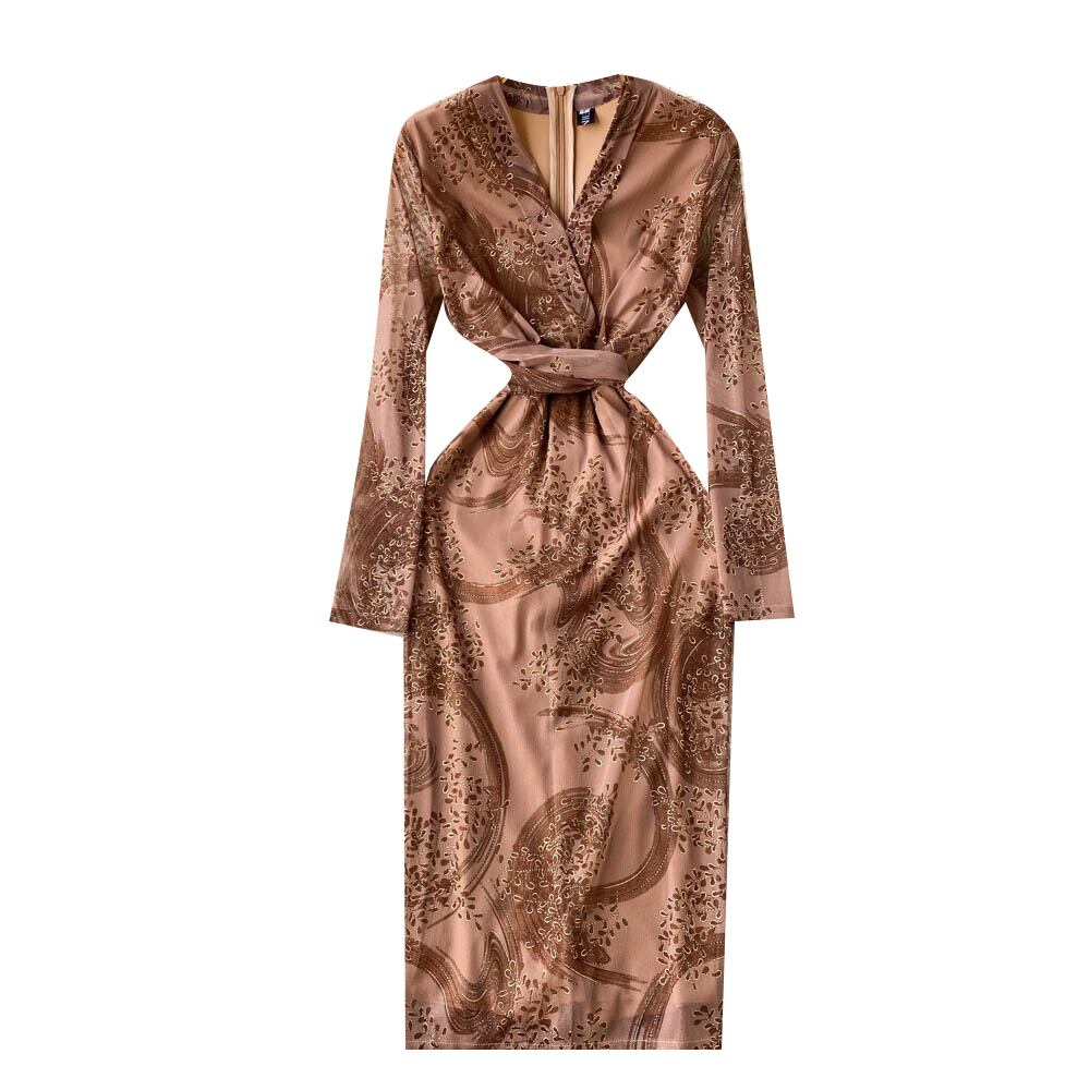 -エンドタイウエスト気質長袖ドレス初秋の新しいプリント V ネックラップヒップスカート美しいロングスカート オータム 秋物 Vネック lyxaj7444256168