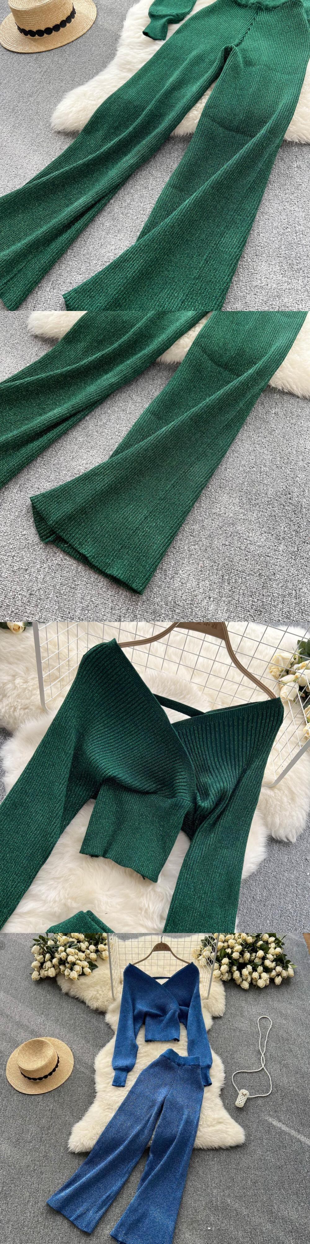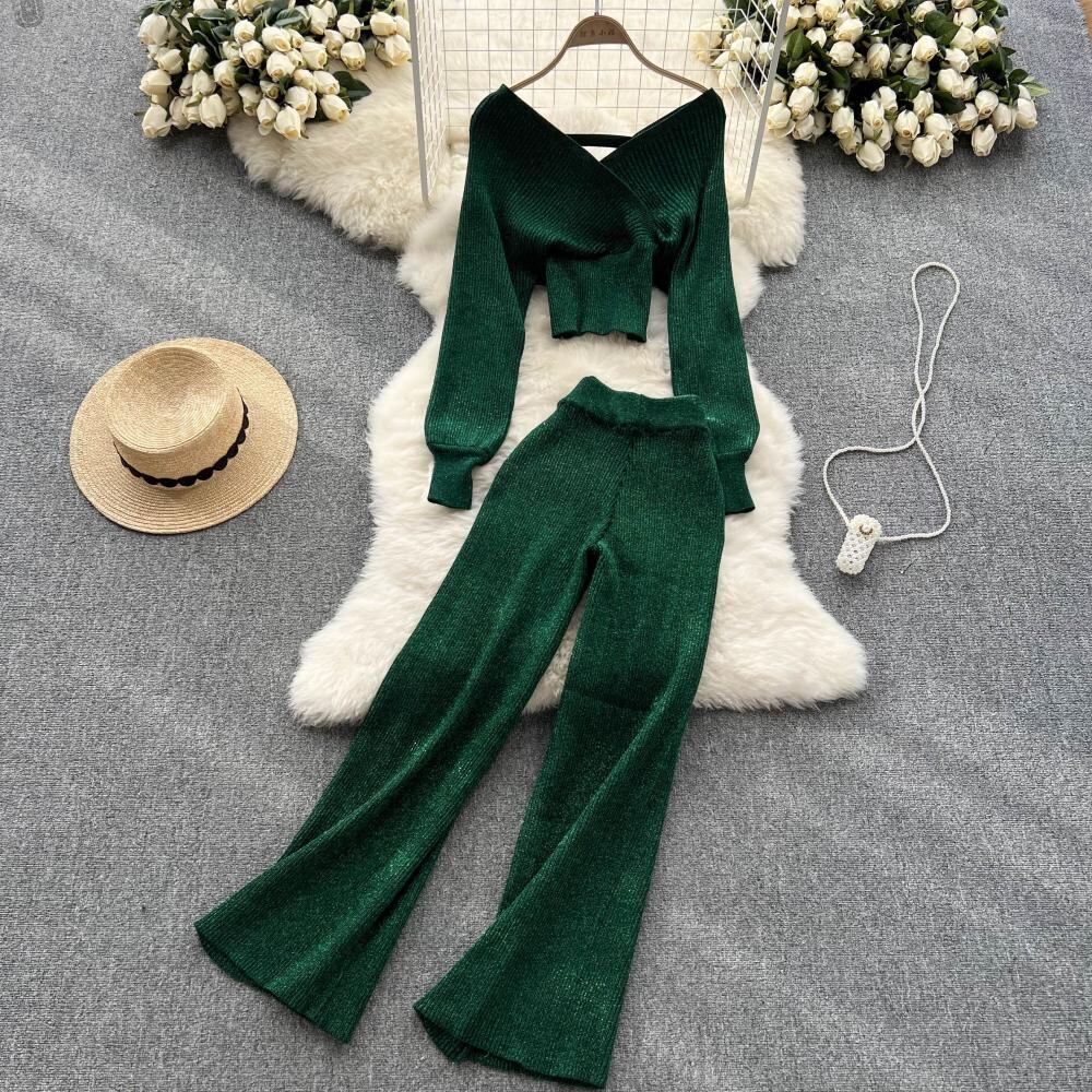 秋冬セレブスーツVネックセクシーショート長袖セーター+ゴムウエストドレープワイドレッグカジュアルパンツ2点セット ロング エラスティック 伸縮 オータム 秋物 ウィンター 冬物 lyxaj8489342856