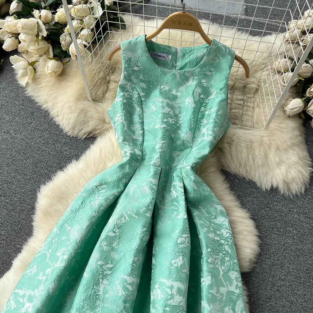 春と夏の新しい気質スリム ウエスト ノースリーブ ベスト ジャカード オーガンジー ドレス女性プリーツ プリンセス A ライン スカート スプリング 春物 サマー 夏物 Aライン lyxaj33654565776