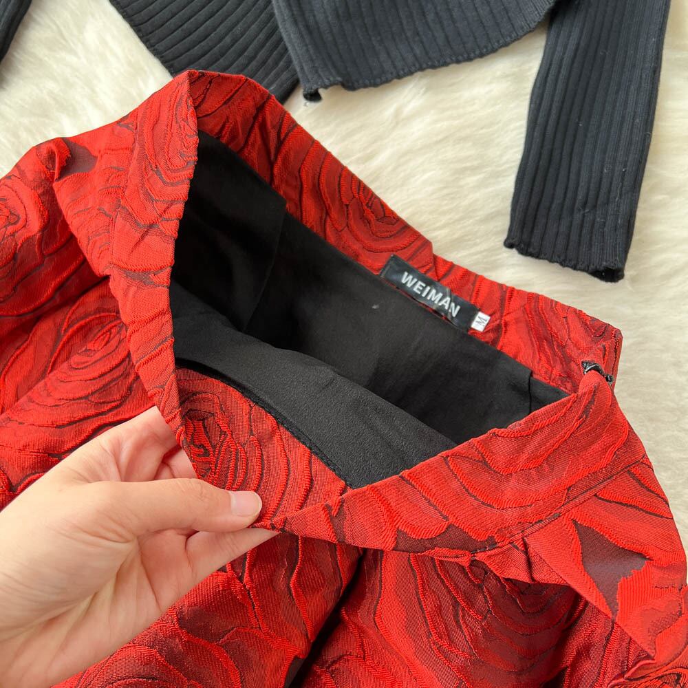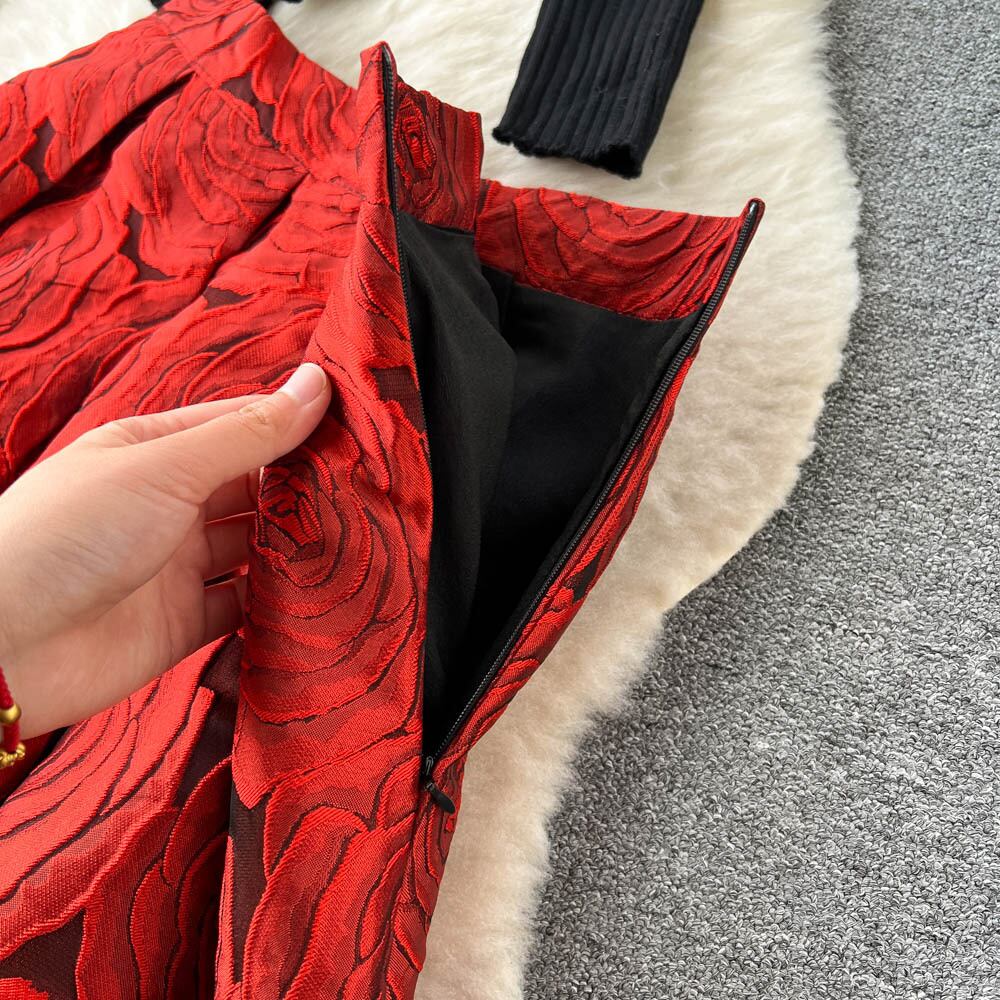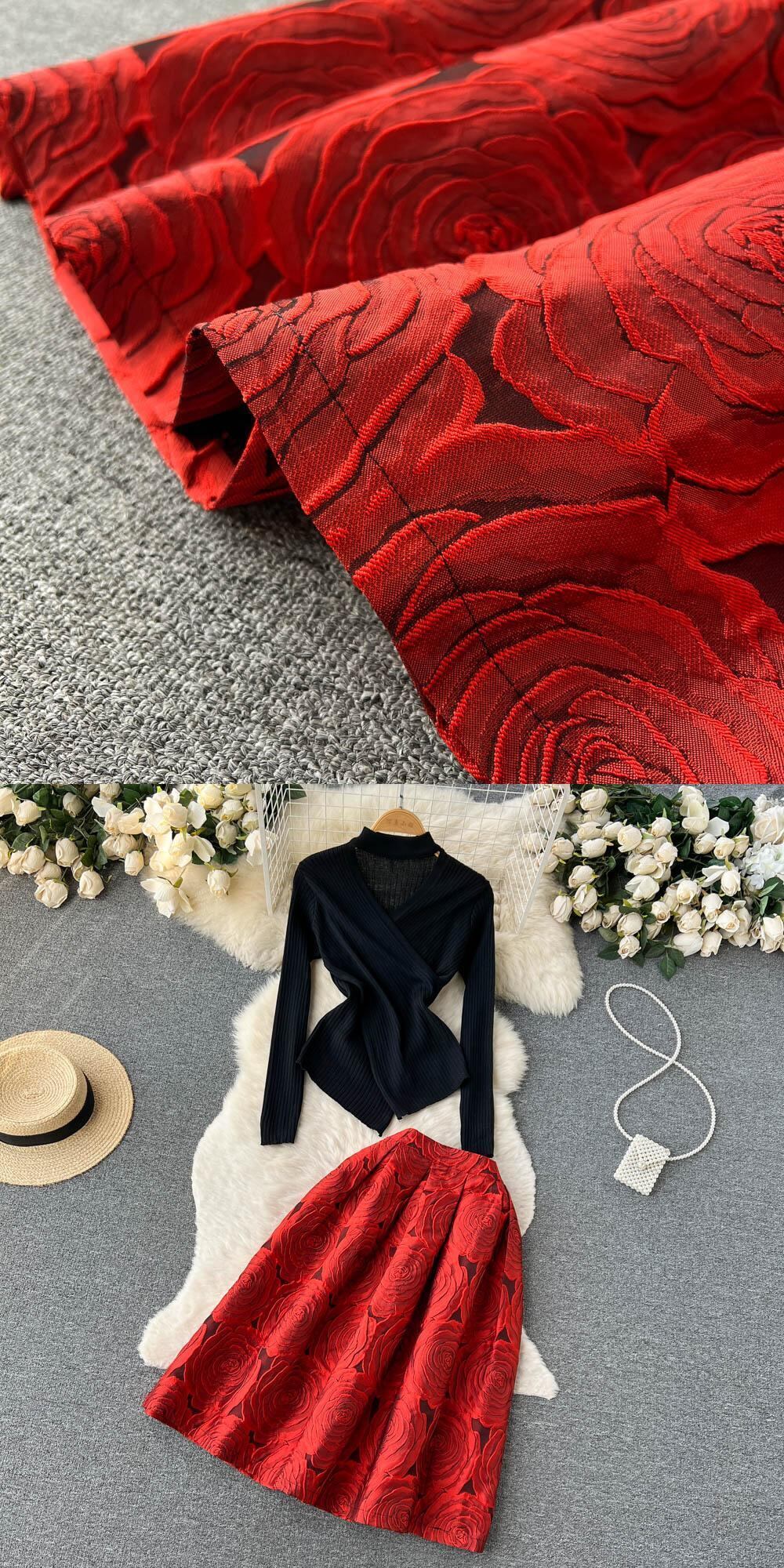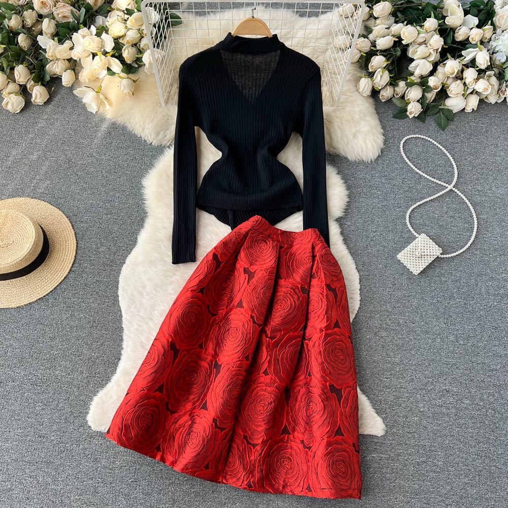 春秋セレブ風クロスVネックイレギュラーニットセータートップ+立体感たっぷりのバラスカートの2点セット スプリング 春物 オータム 秋物 lyxaj25302551713