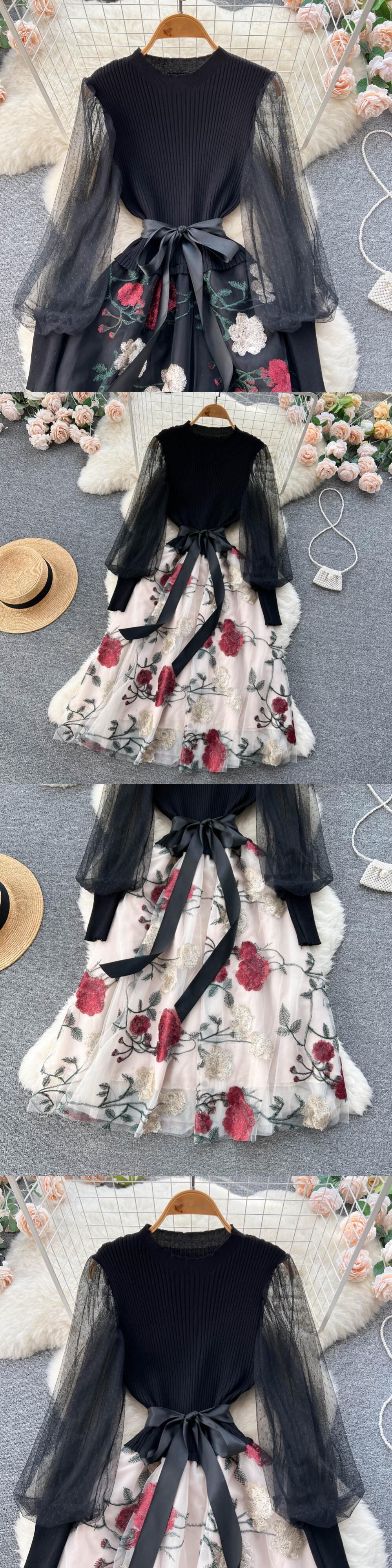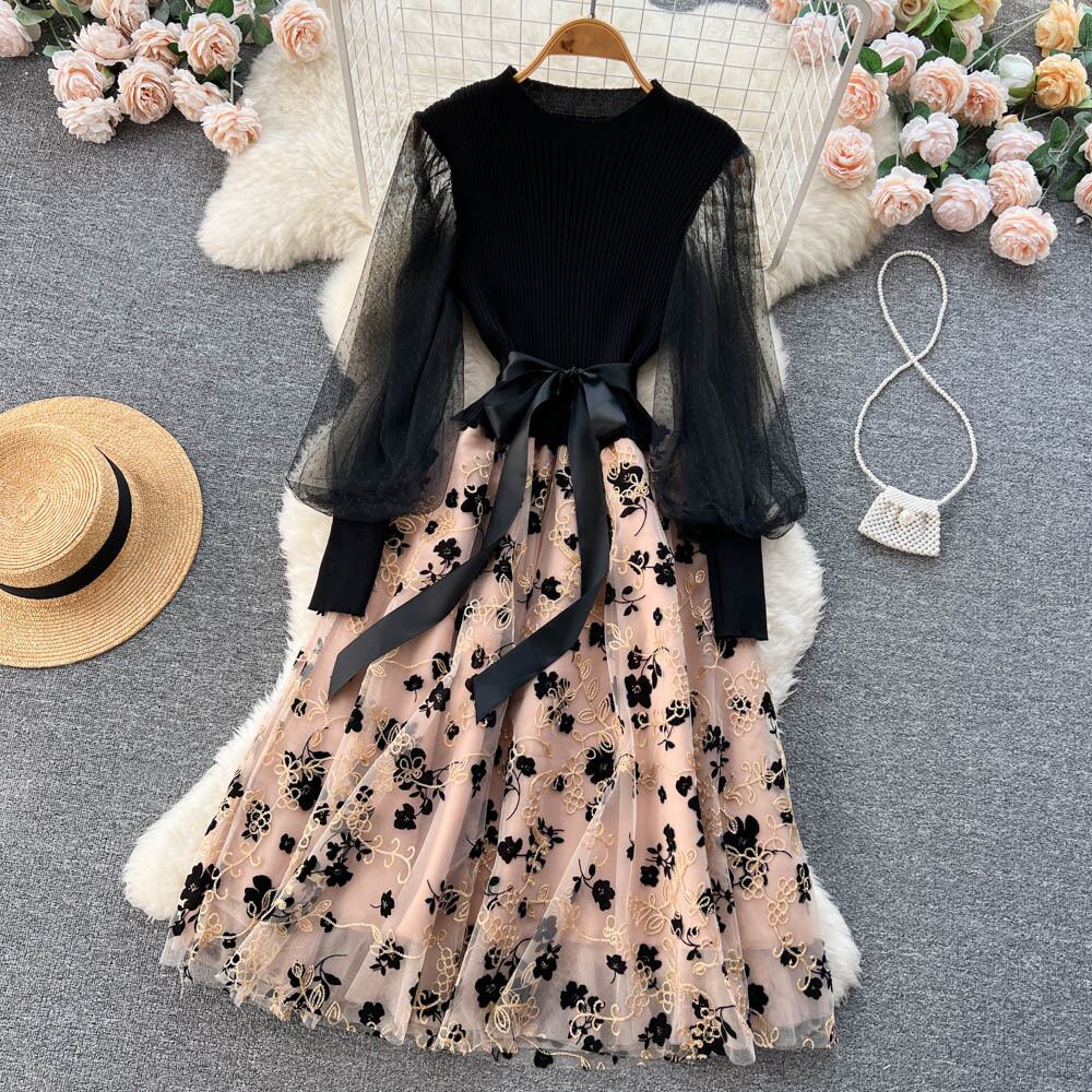 -品質メッシュ ランタン スリーブ ドレス秋婦人服ニッチ デザイン プリント モザイク ウエスト A ライン スカート ランタンスリーブ オータム 秋物 Aライン lyxaj14412074822