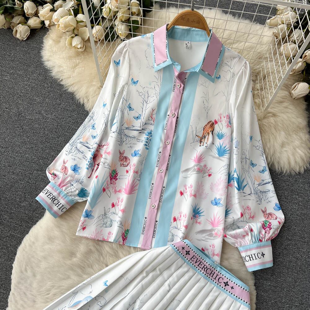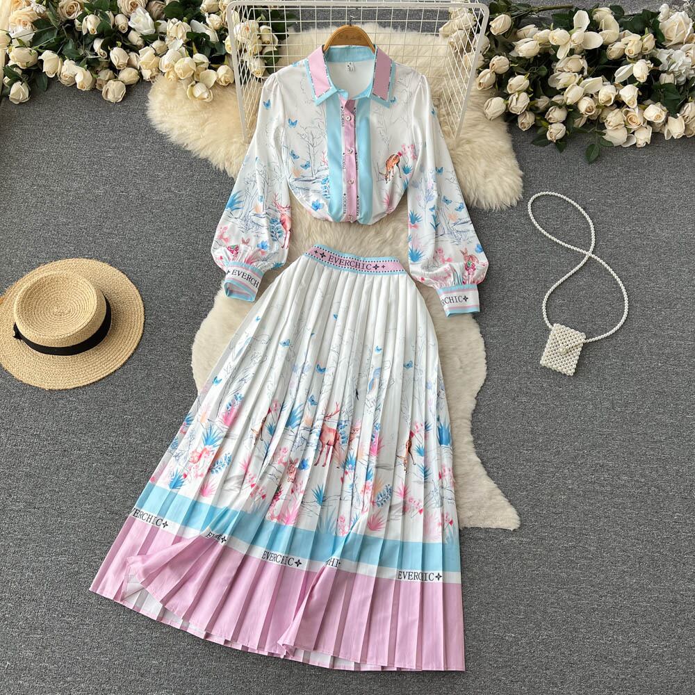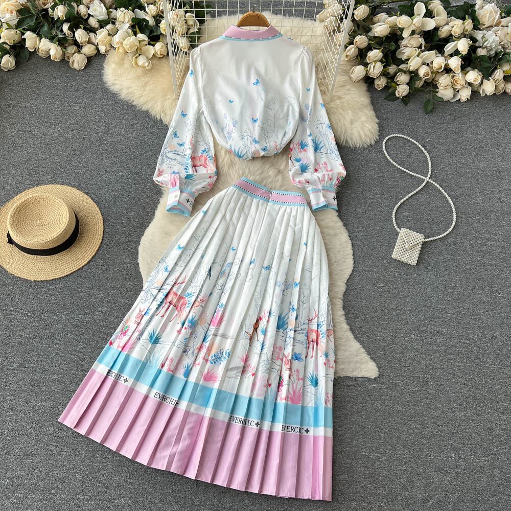 秋の新エスニックスタイルスーツ女性の高品質プリントラペル長袖シャツプリーツスカートツーピーストレンディ ロング オータム 秋物 lyxaj95997159934