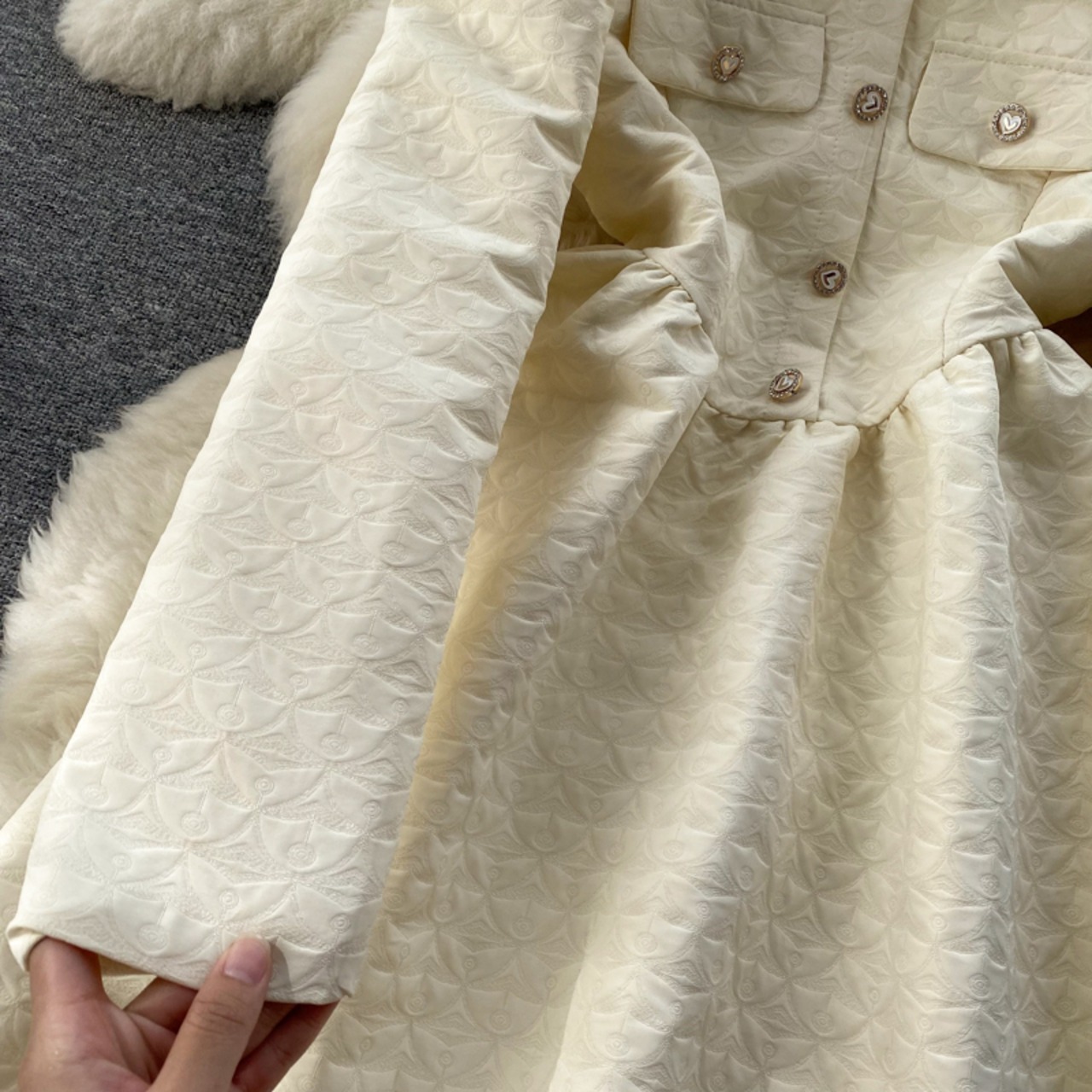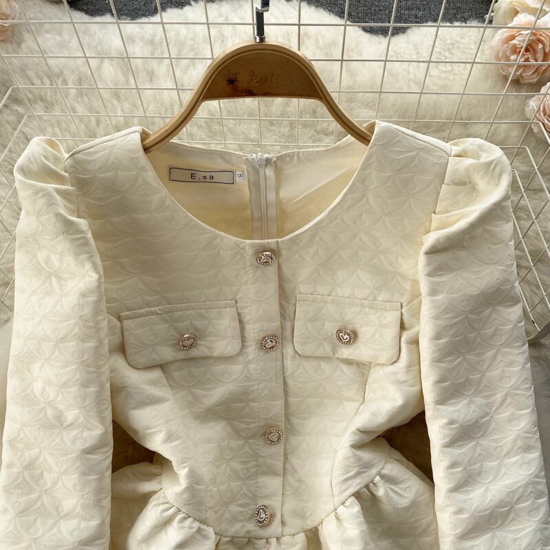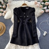 小ぶりな香りの風ドレス秋冬新作フレンチパフスリーブブレストボタン上品なデザイン感の細いAラインふんわりスカート エレガント ふわふわ オータム 秋物 ウィンター 冬物 lyxaj41385593356