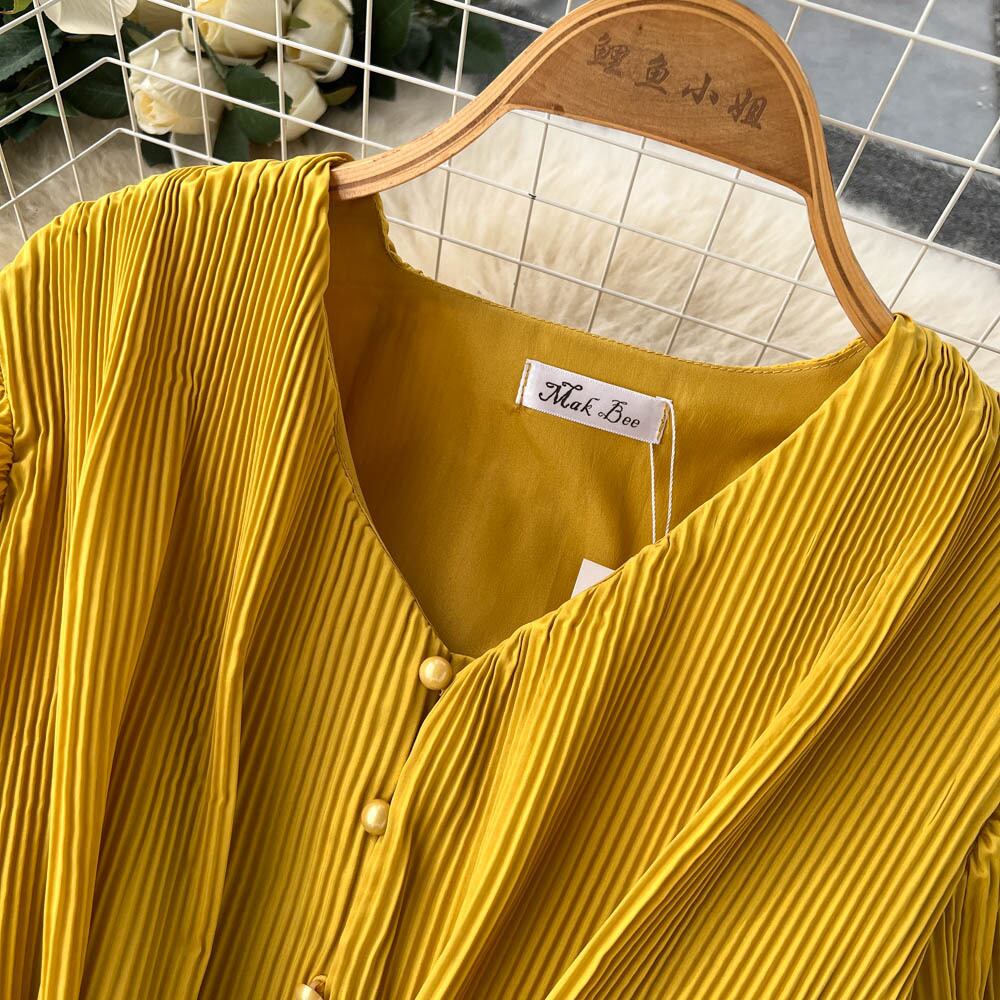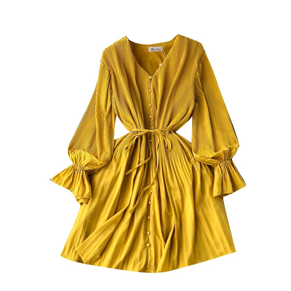 秋の新フレンチ V ネック ネクタイ バブル長袖ウエスト痩身スリムな気質プリーツ プリンセス ドレス ロング オータム 秋物 Vネック lyxaj78465297636