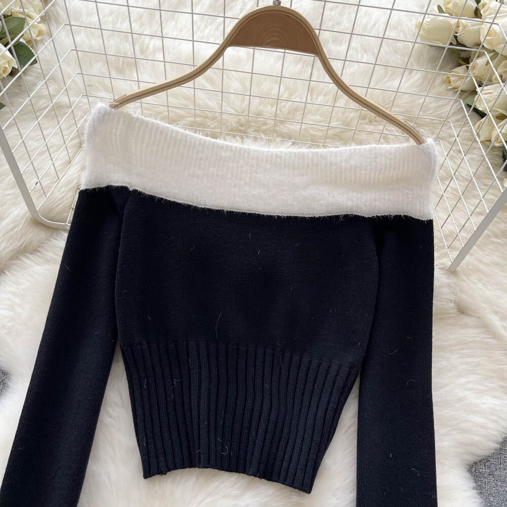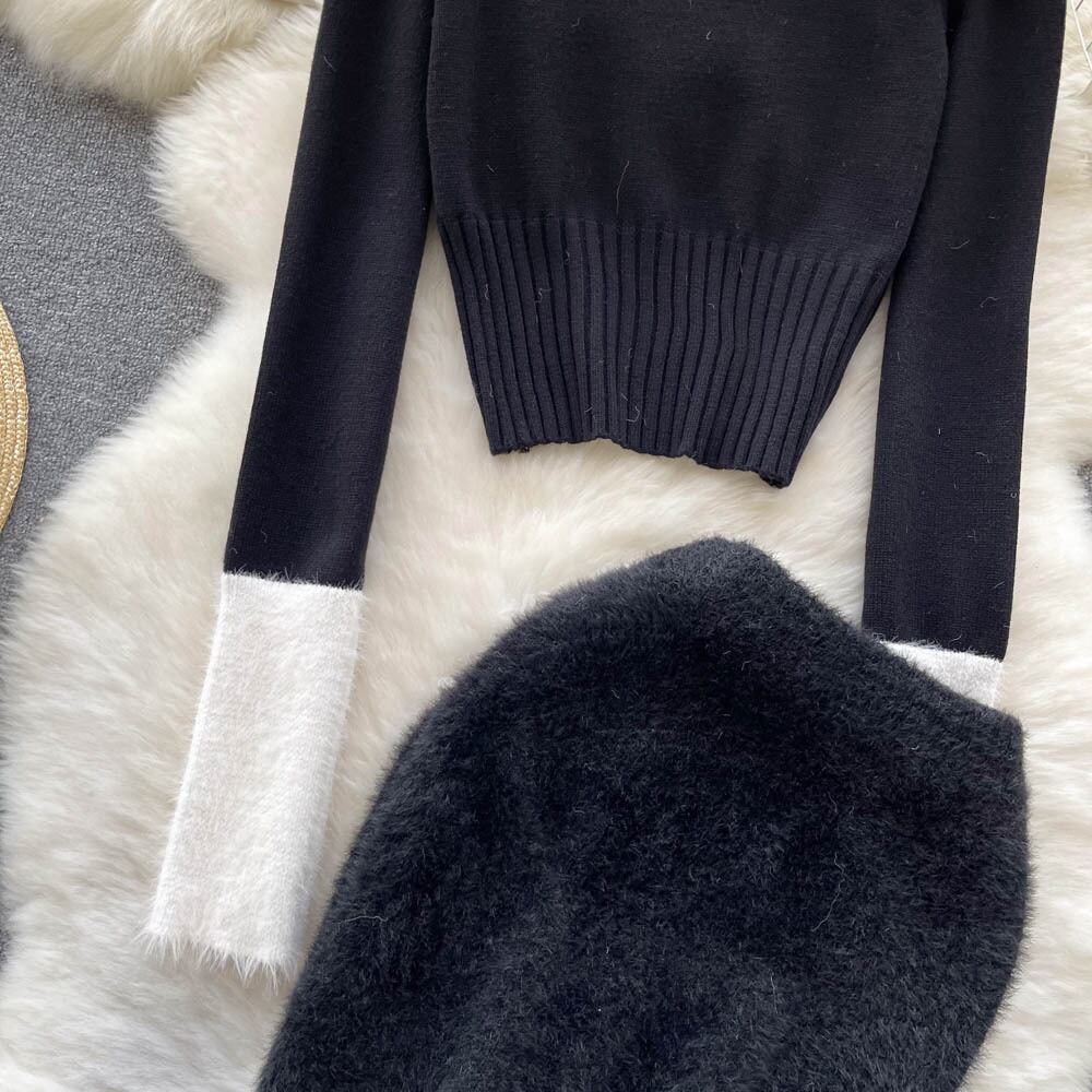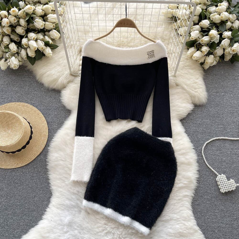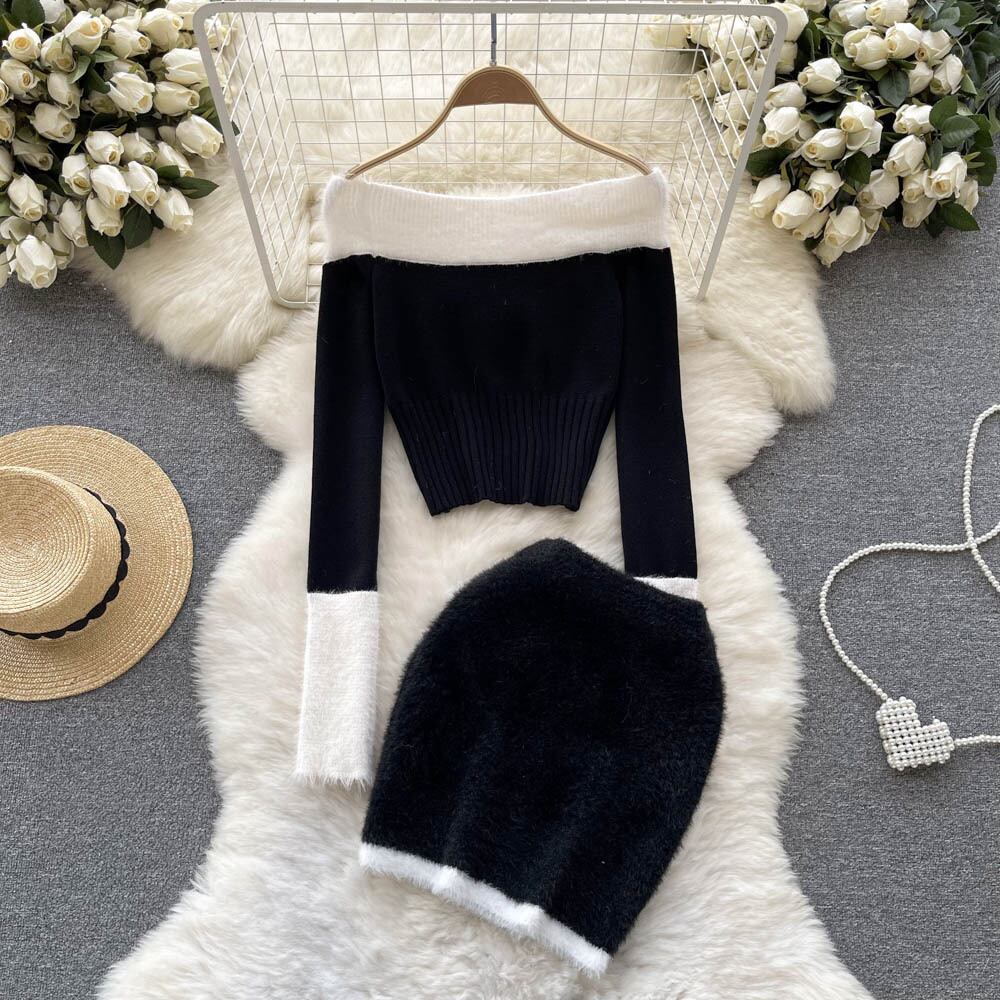 優しい風春と秋のセレブの柔らかいモチスーツの女性のワンショルダーの配色のウールのセーター+ヒップスカートのツーピースのトレンディ スプリング 春物 オータム 秋物 lyxaj32648513965